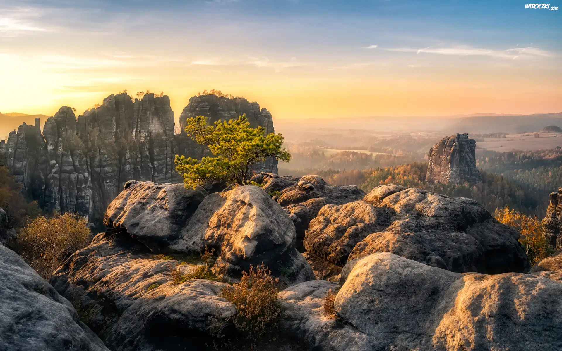 Zdjęcia, Niemcy, Park Narodowy Saskiej Szwajcarii, Góry Połabskie, Drzewo, Skały, Wschód słońca, Mgła