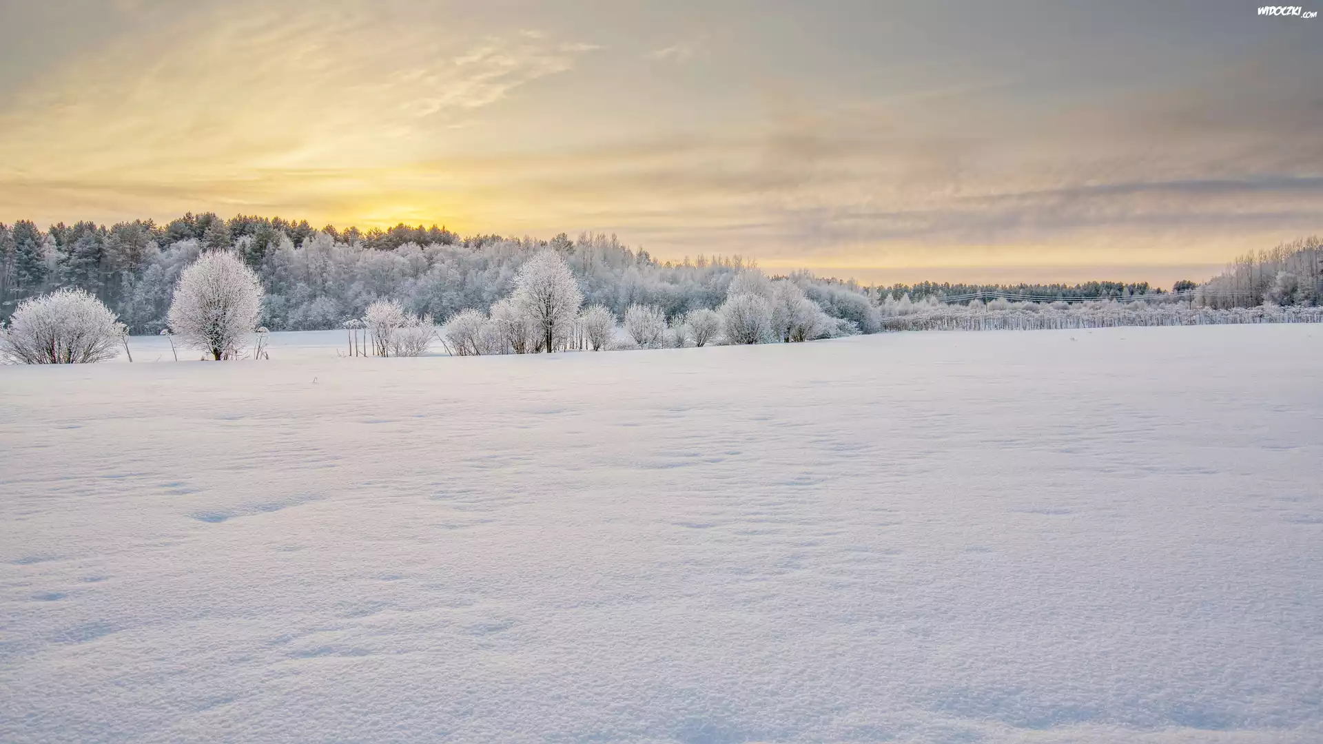Polana, Drzewa, Zima, Wschód słońca, Niebo