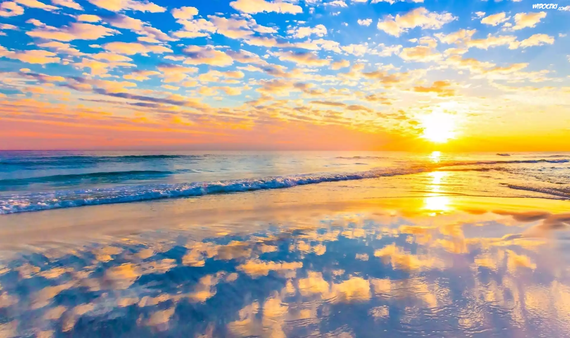 Zdjęcia, Wschód Słońca, Morze, Obłoki, Odbicie