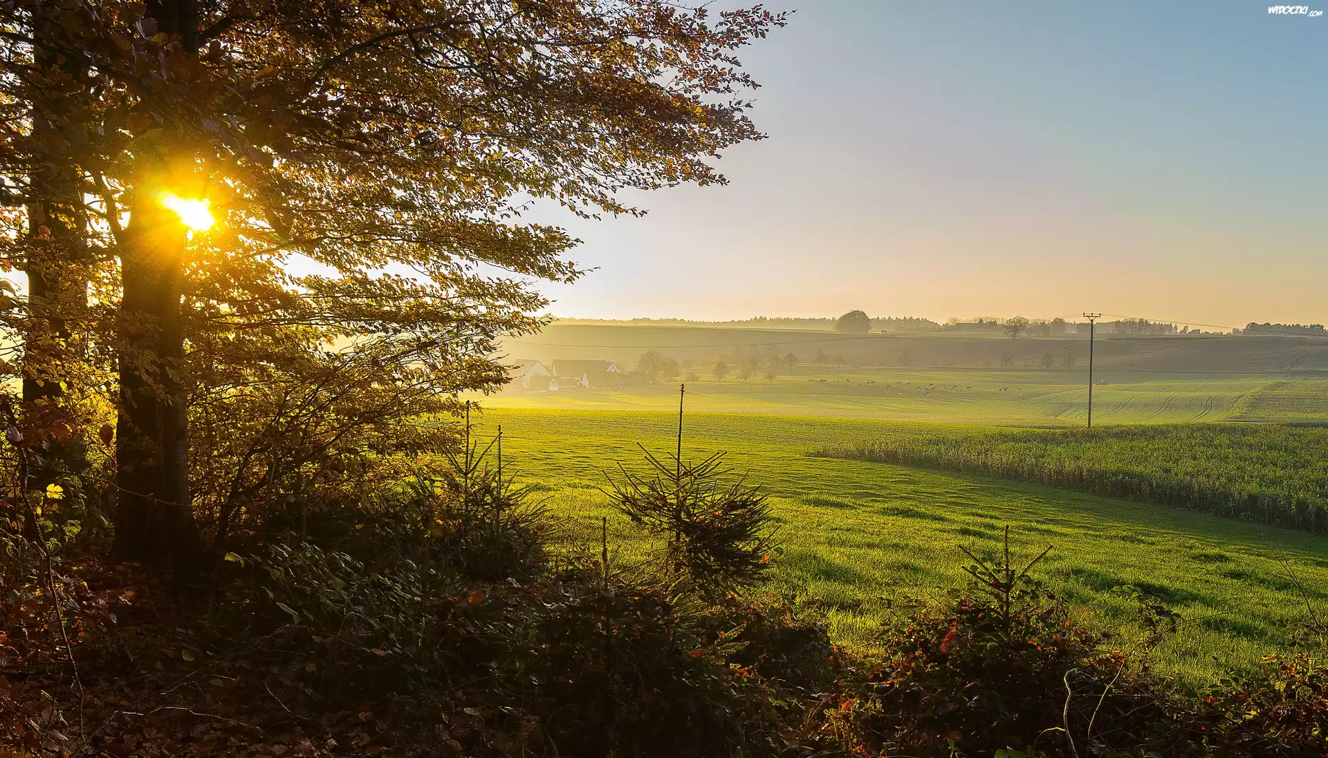 Zdjęcia, Wschód, Słońca, Łąki, Pola, Las
