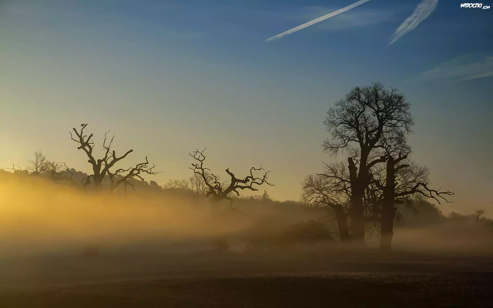 Poranek, Wschód słońca, Mgła, Drzewa, Dęby, Rogalin