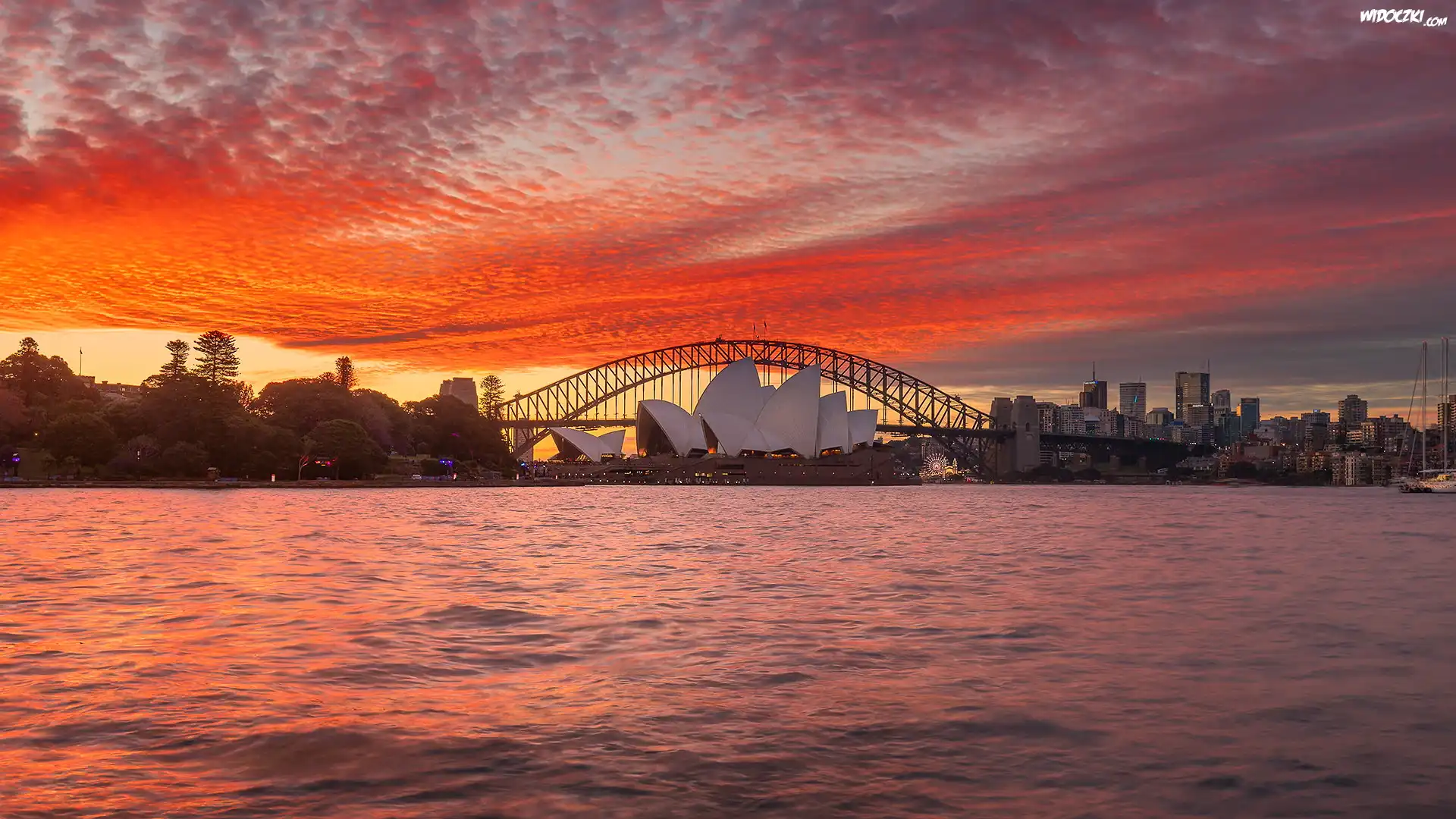 Zdjęcia, Wschód słońca, Zatoka Port Jackson, Sydney Opera House, Most Sydney Harbour, Sydney, Australia