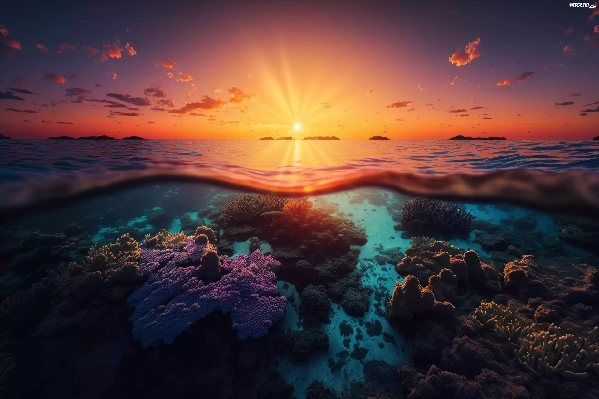 Morze, Koralowce, Niebo, Wschód słońca, Promienie