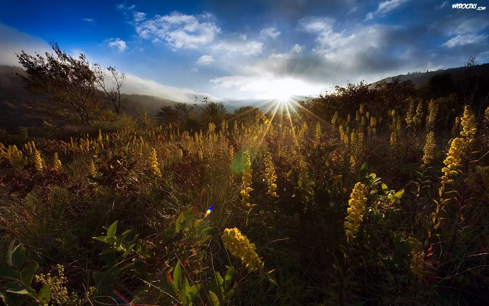 Zdjęcia, Łąka, Rośliny, Wschód Słońca