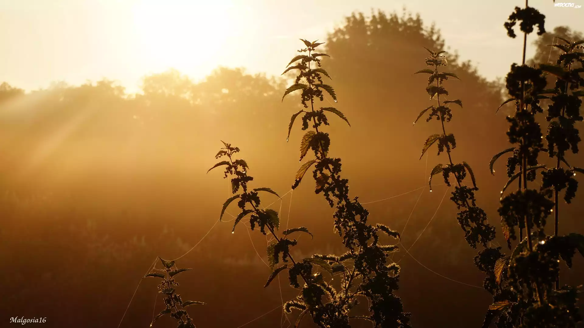 Zdjęcia, Wschód Słońca, Mgła, Rośliny, Rosa