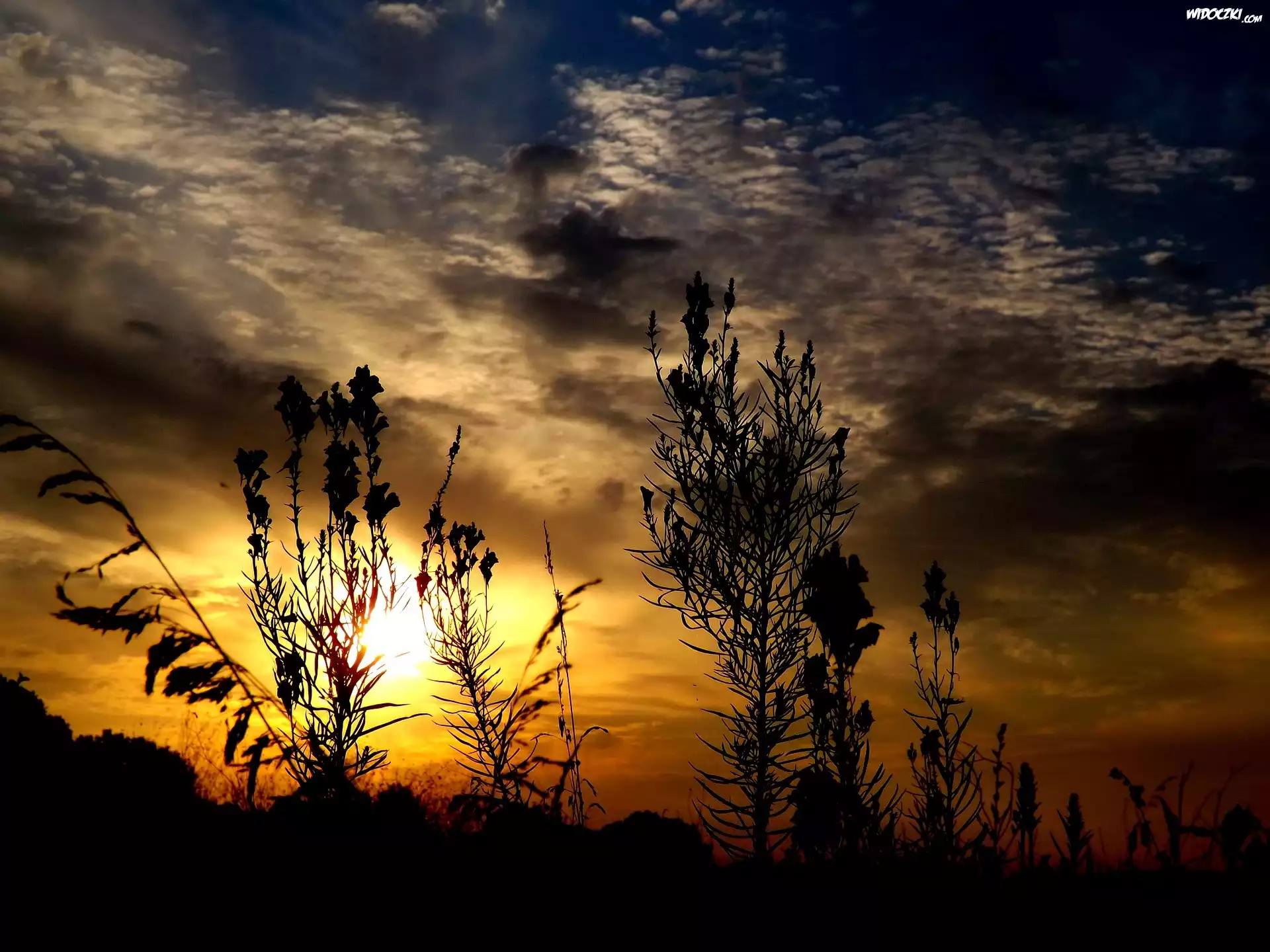 Wschód, Słońca, Niebo, Chmury, Rośliny, Drzewa