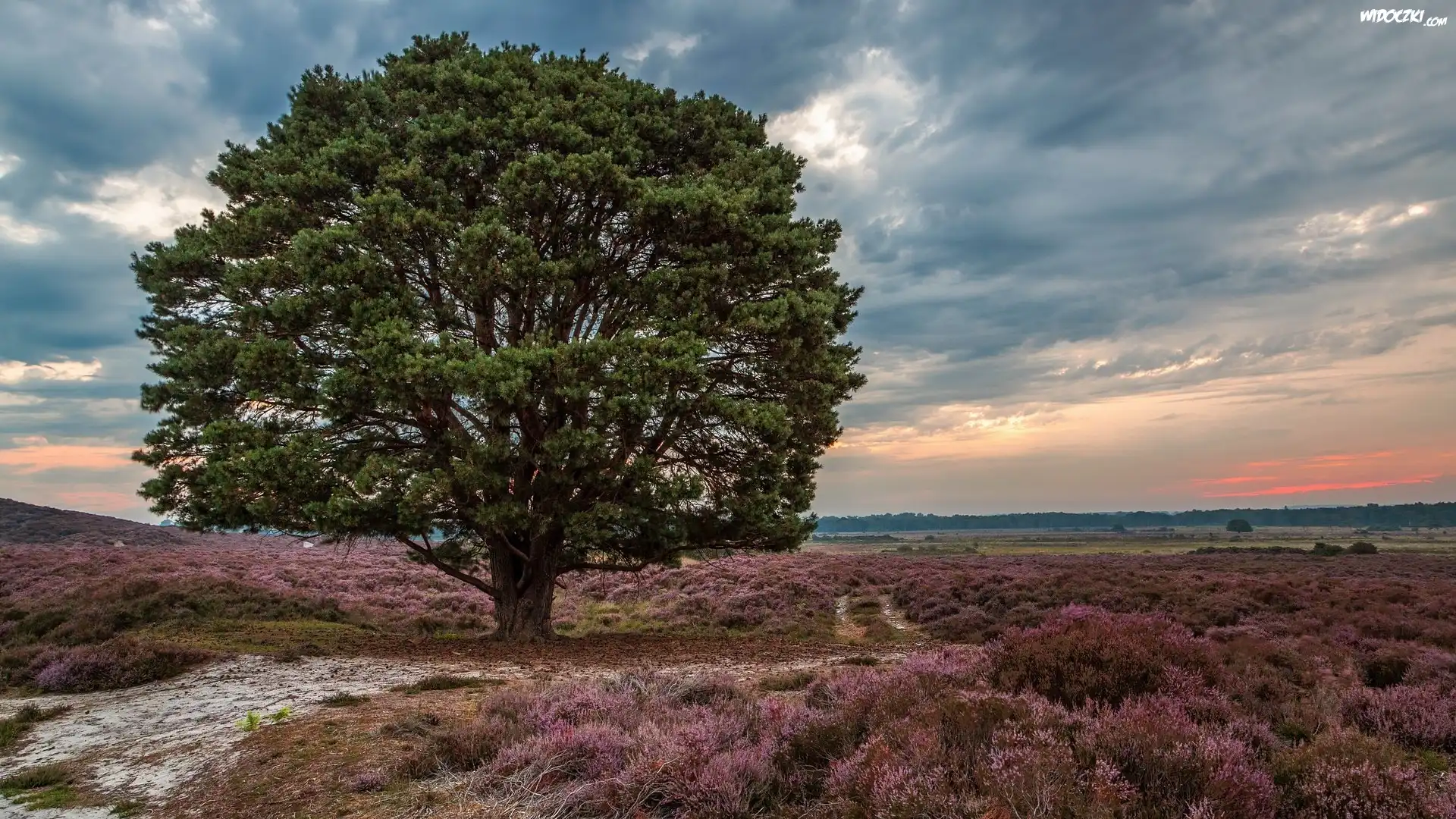 Zdjęcia, Wschód słońca, Wrzosowisko, Drzewo, Rezerwat Przyrody, Roydon Common, Anglia