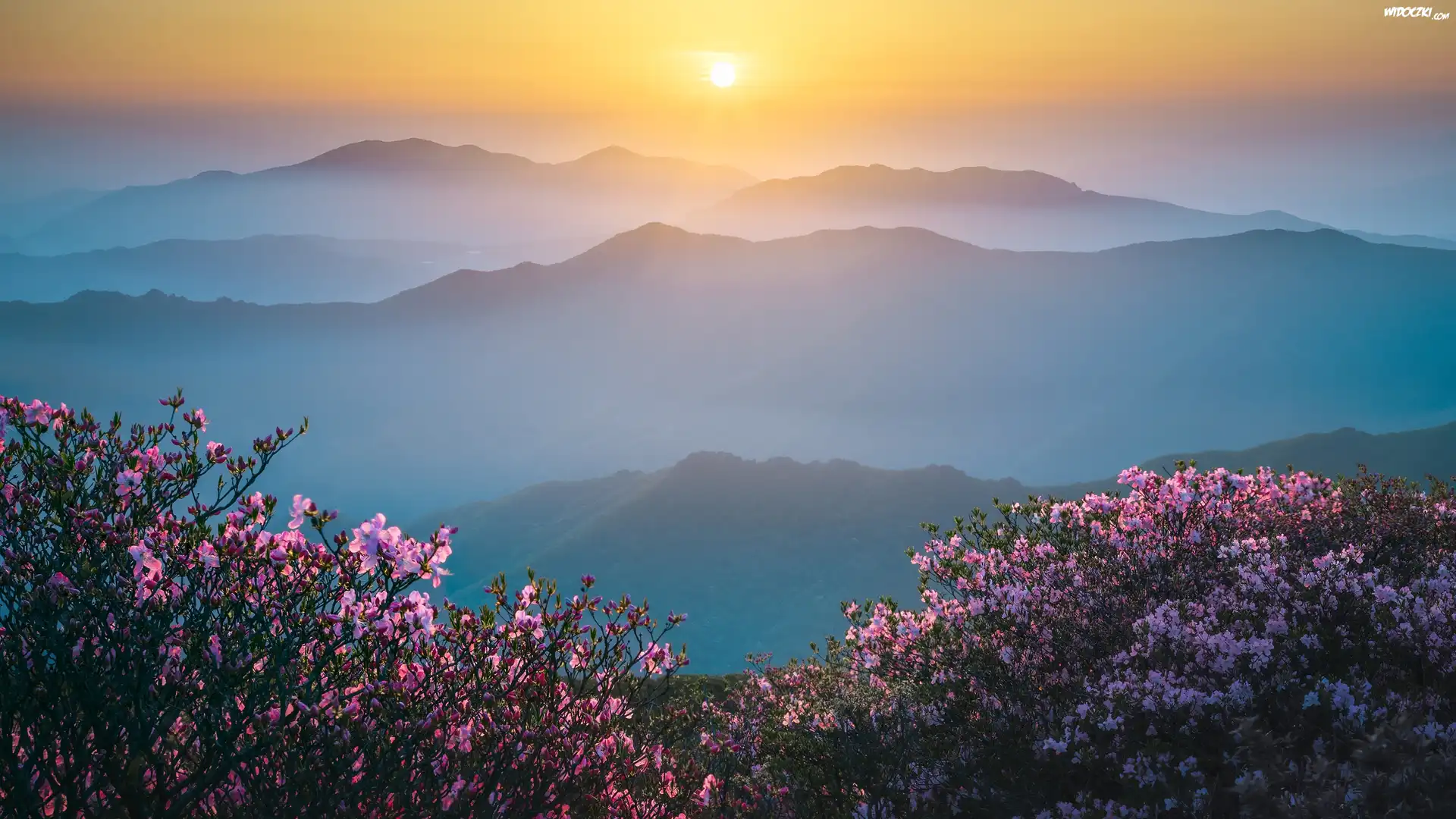 Góry, Wschód słońca, Mgła, Różowe, Kwiaty, Krzewy, Różaneczniki