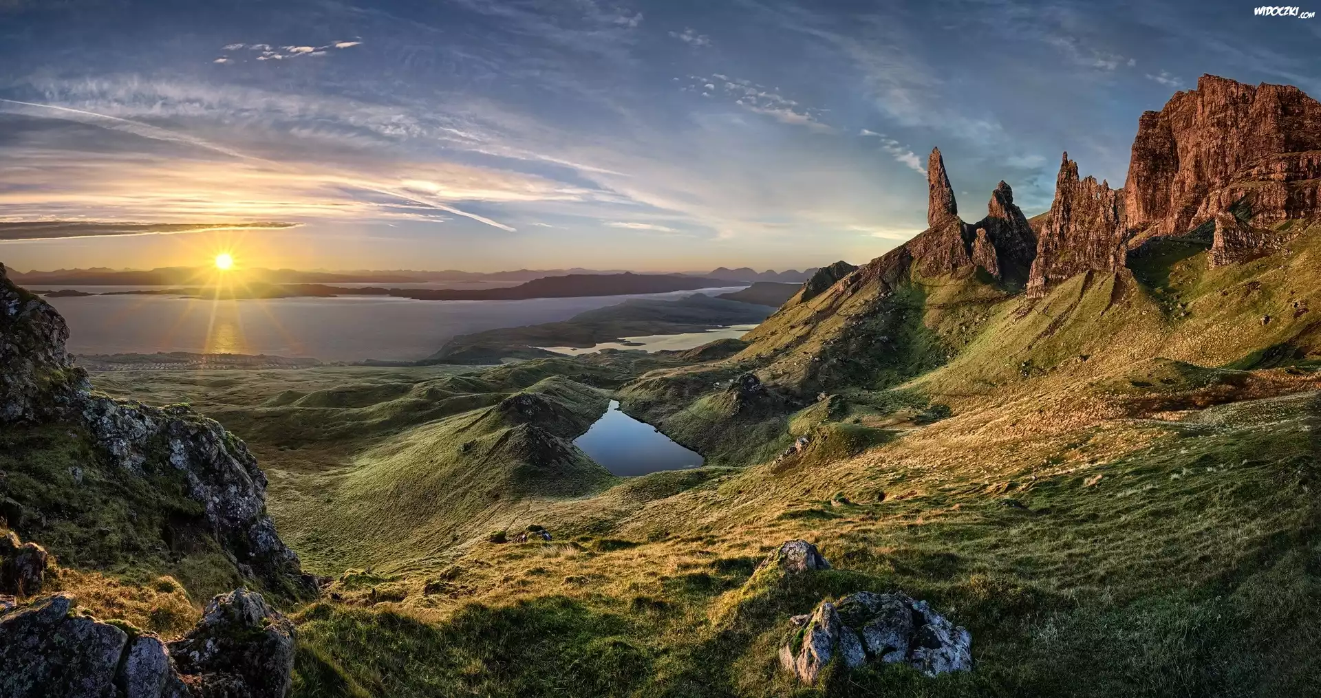 Wschód, Słońca, Góry, Skały, Jeziora