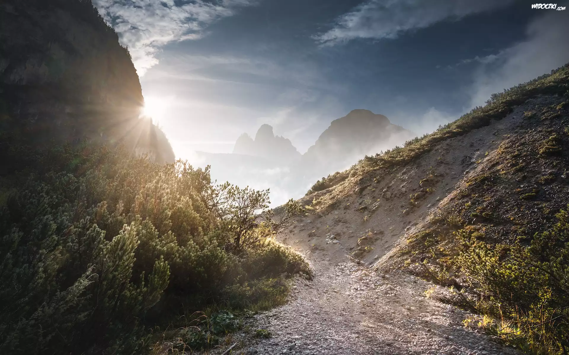 Góry, Wschód słońca, Krzewy, Ścieżka