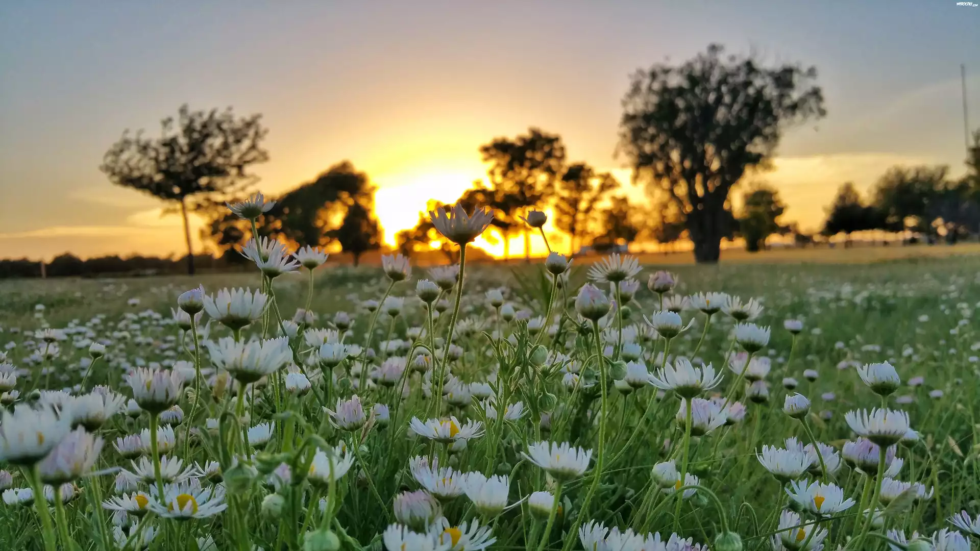 Wschód słońca, Łąka, Stokrotki, Drzewa
