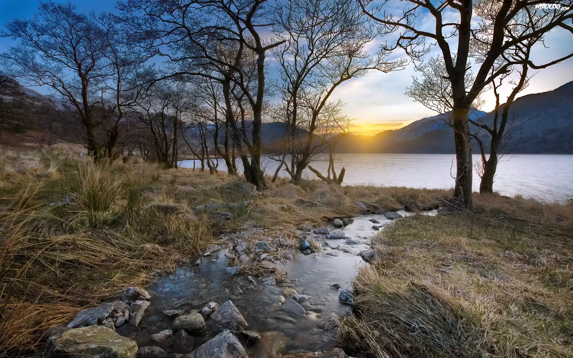 Zdjęcia, Wschód, Słońca, Jezioro, Strumyk, Drzewa