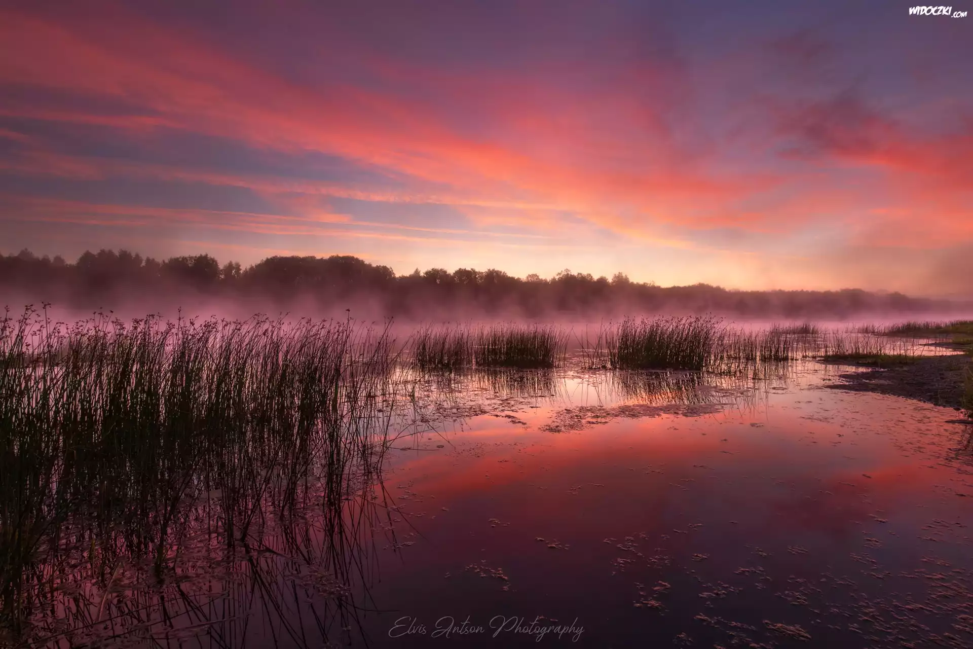 Zdjęcia, Jezioro, Trawy, Mgła, Wschód słońca, Świt