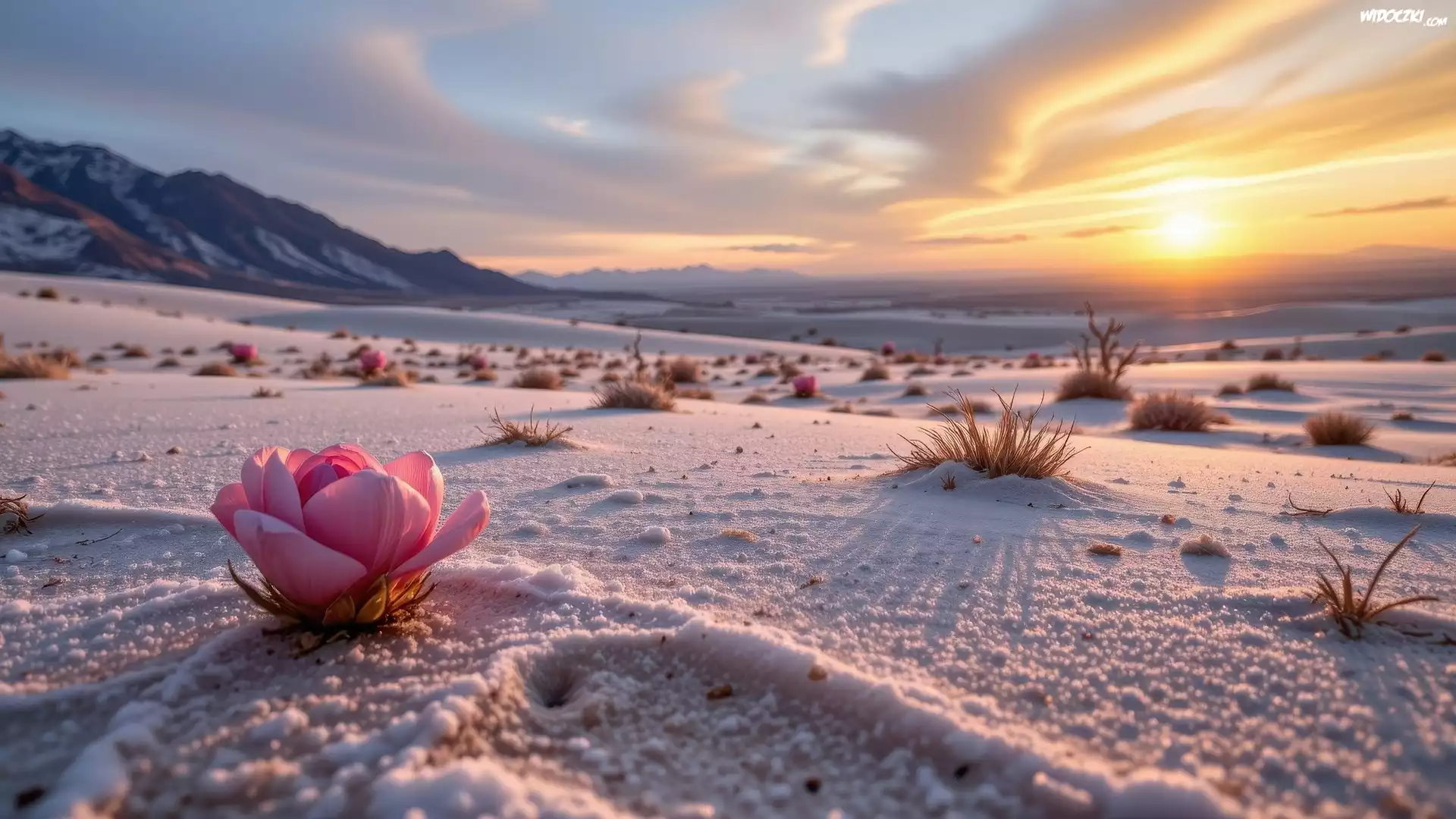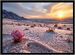 Zdjęcia, Wschód słońca, Pustynia, Różowy, Kwiat, Kępki, Trawy, Góry, Grafika