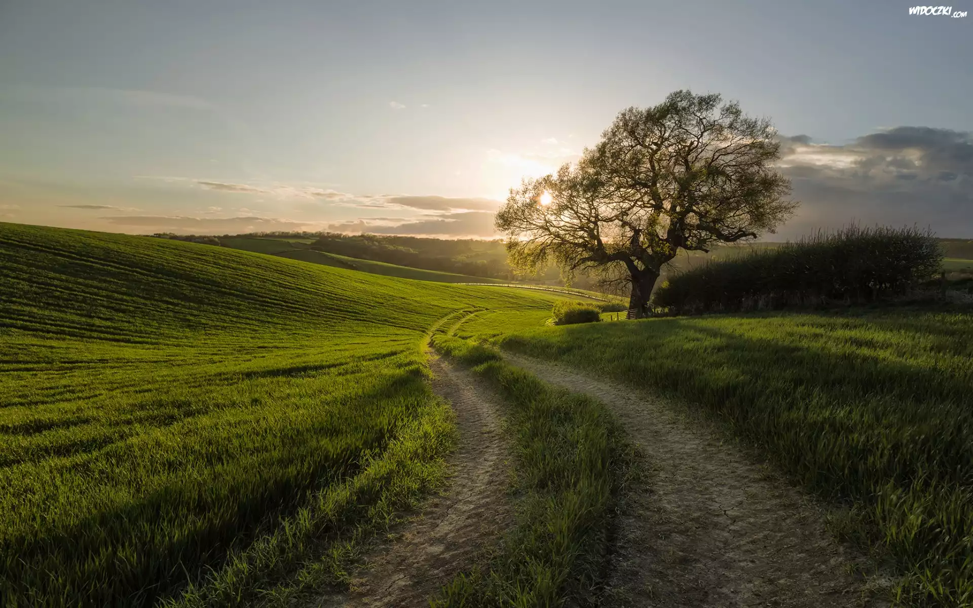 Zdjęcia, Wschód słońca, Droga, Wiosna, Drzewo