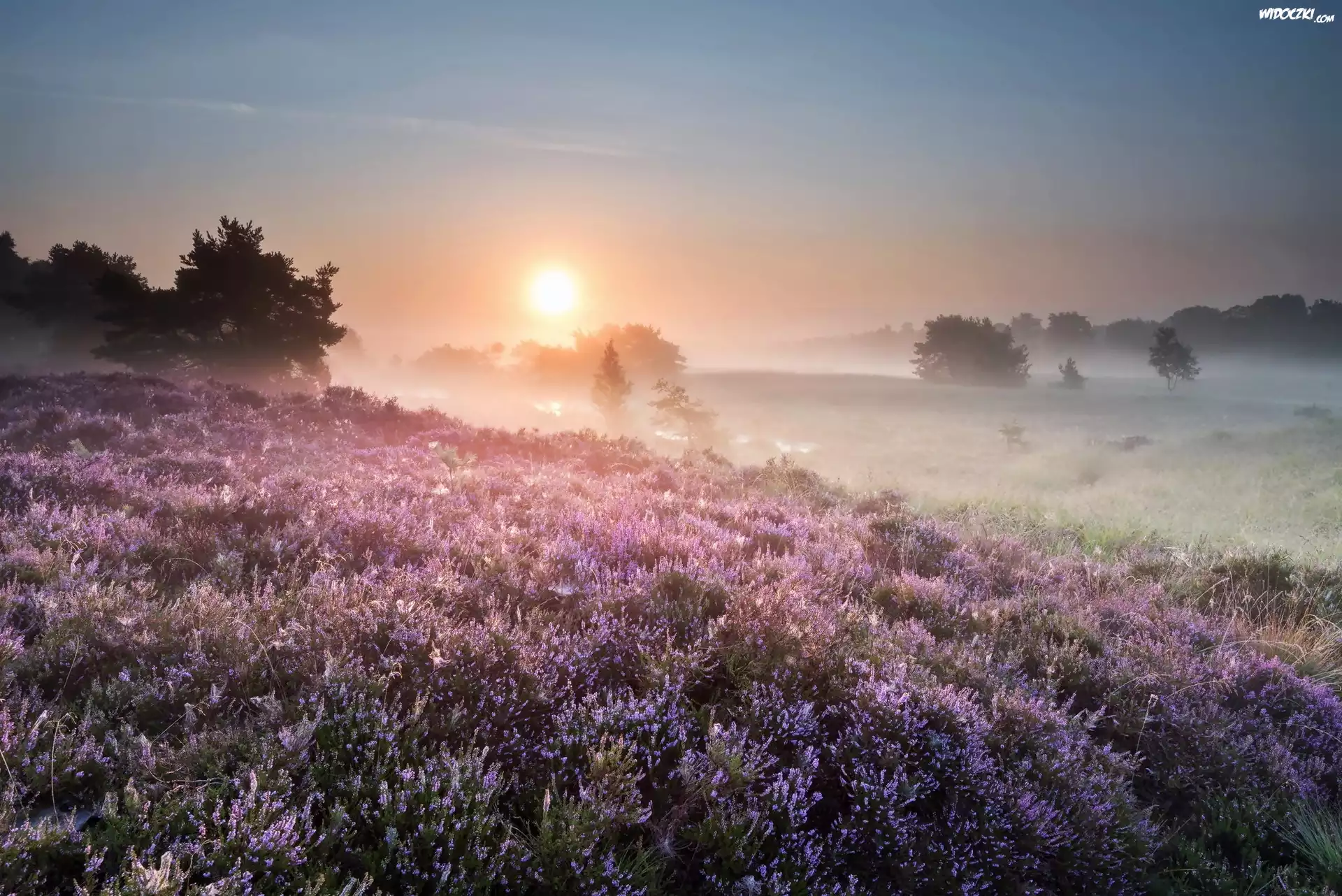Wschód, Słońca, Drzewa, Łąki, Wrzosowisko, Mgła