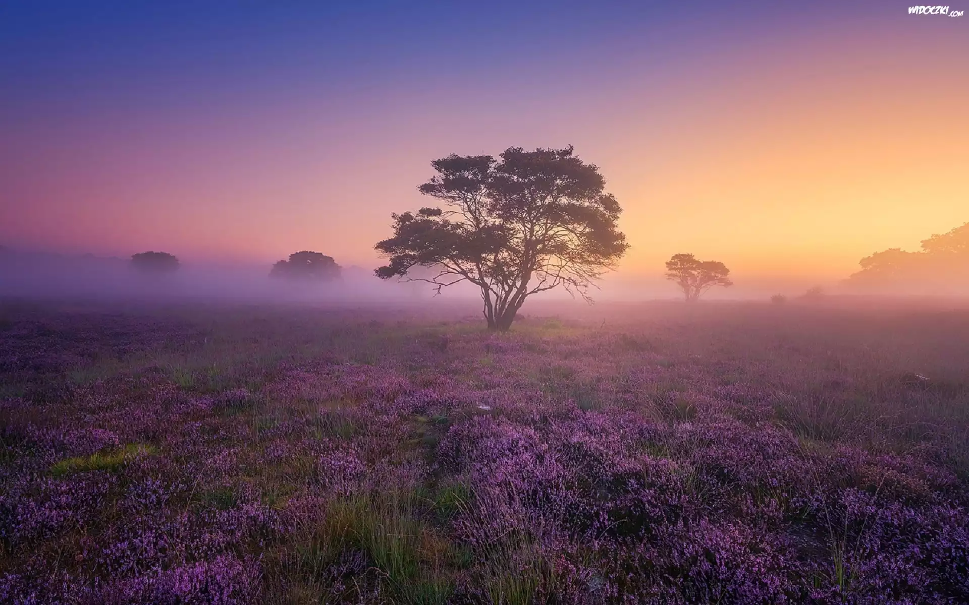 Zdjęcia, Wschód, Słońca, Mgła, Wrzosowisko, Drzewa