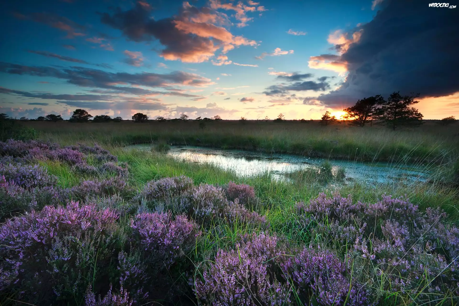 Zdjęcia, Wschód słońca, Trawy, Drzewa, Wrzosy, Bagno, Wrzosowisko