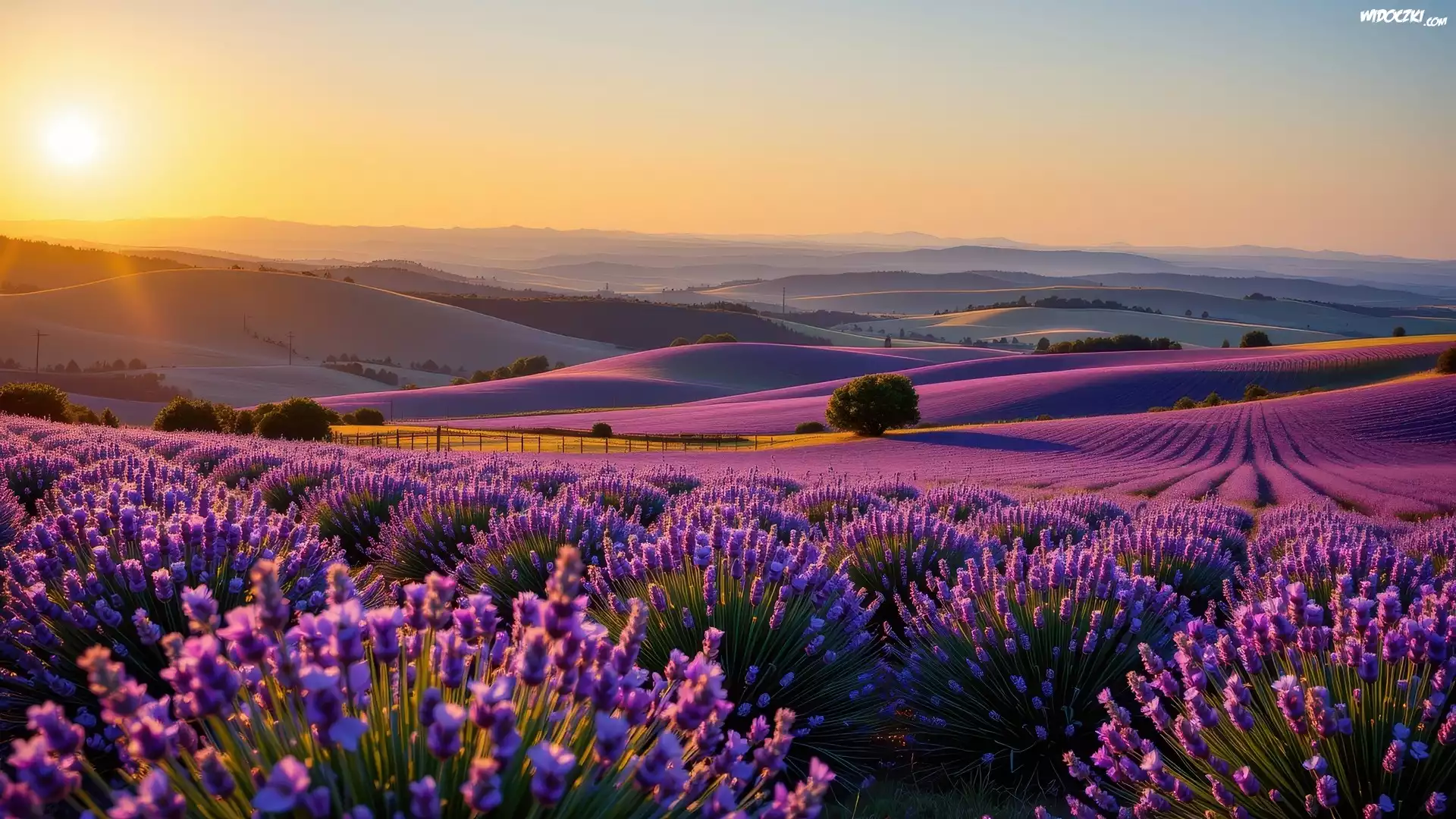 Zdjęcia, Lawenda, Pole, Wzgórza, Wschód słońca, Drzewa, AI