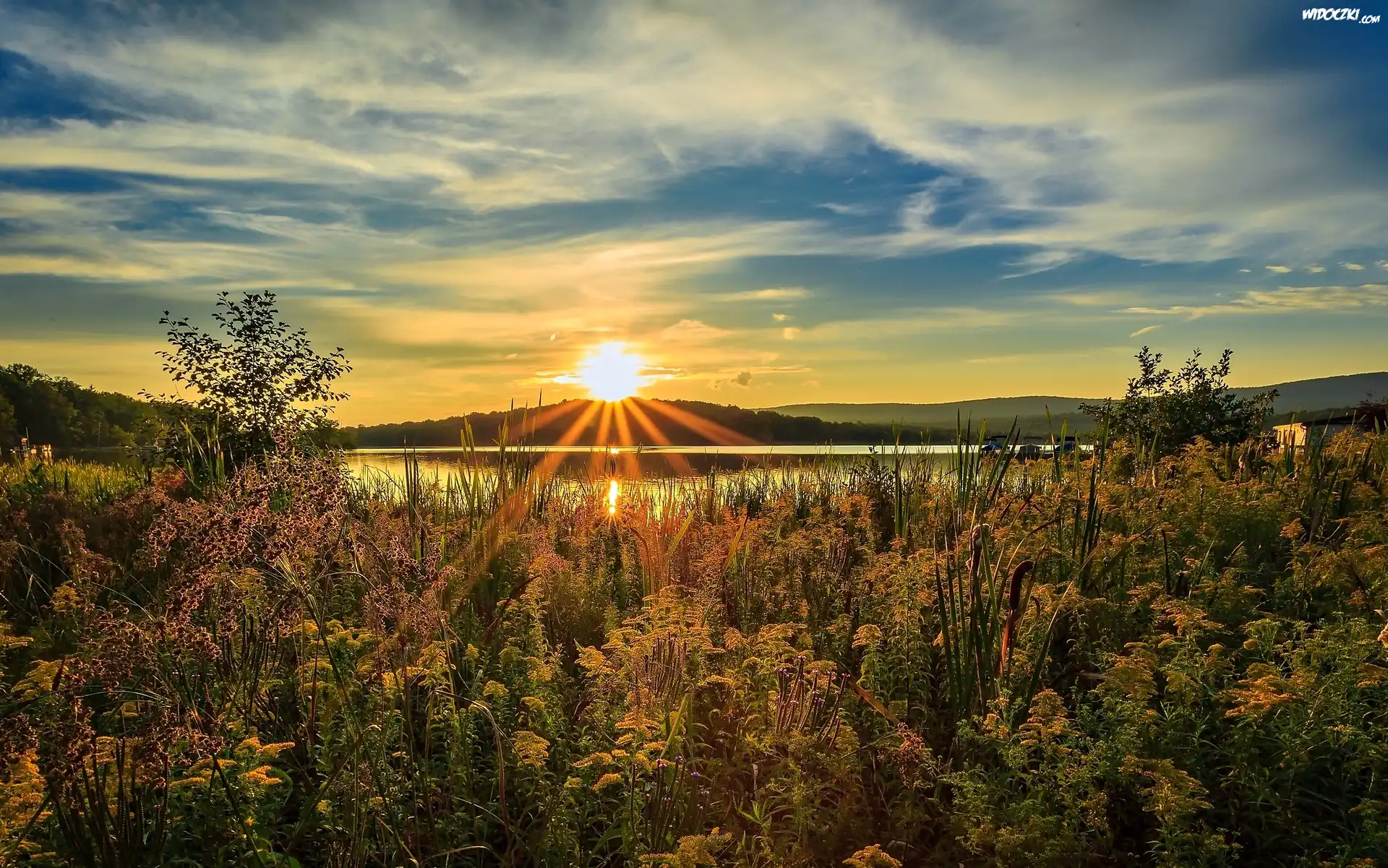 Zdjęcia, Wschód Słońca, Wzgórza, Rzeka, Zarośla, Trzciny