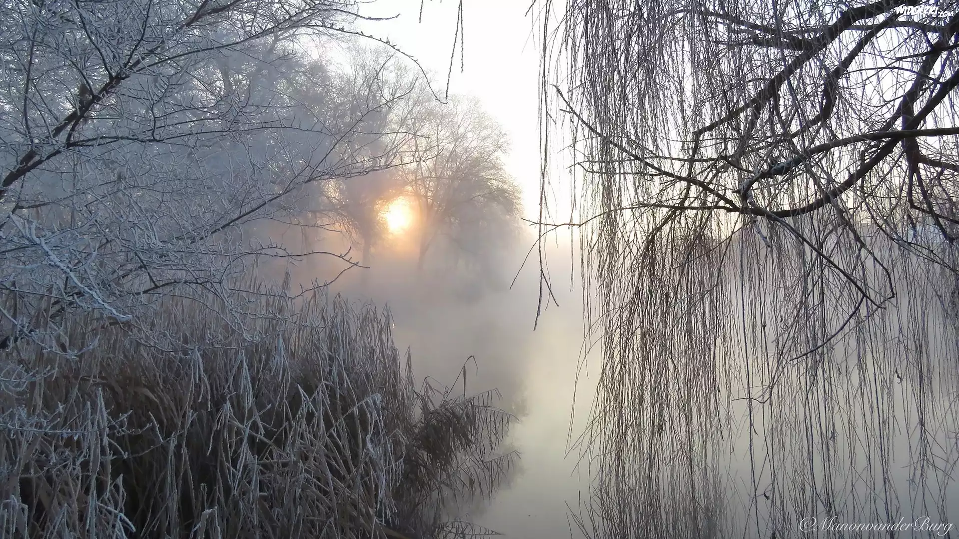 Zima, Wschód słońca, Mgła, Jezioro, Oszronione, Drzewa