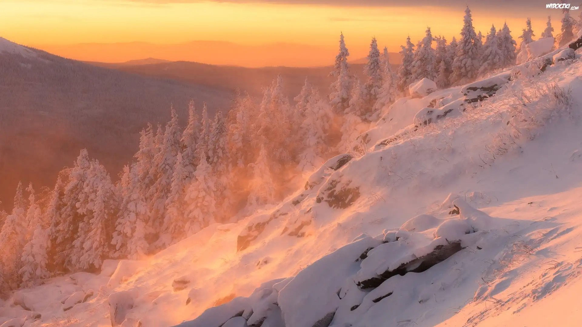 Zdjęcia, Zima, Wschód słońca, Góry, Ośnieżone, Drzewa, Świerki