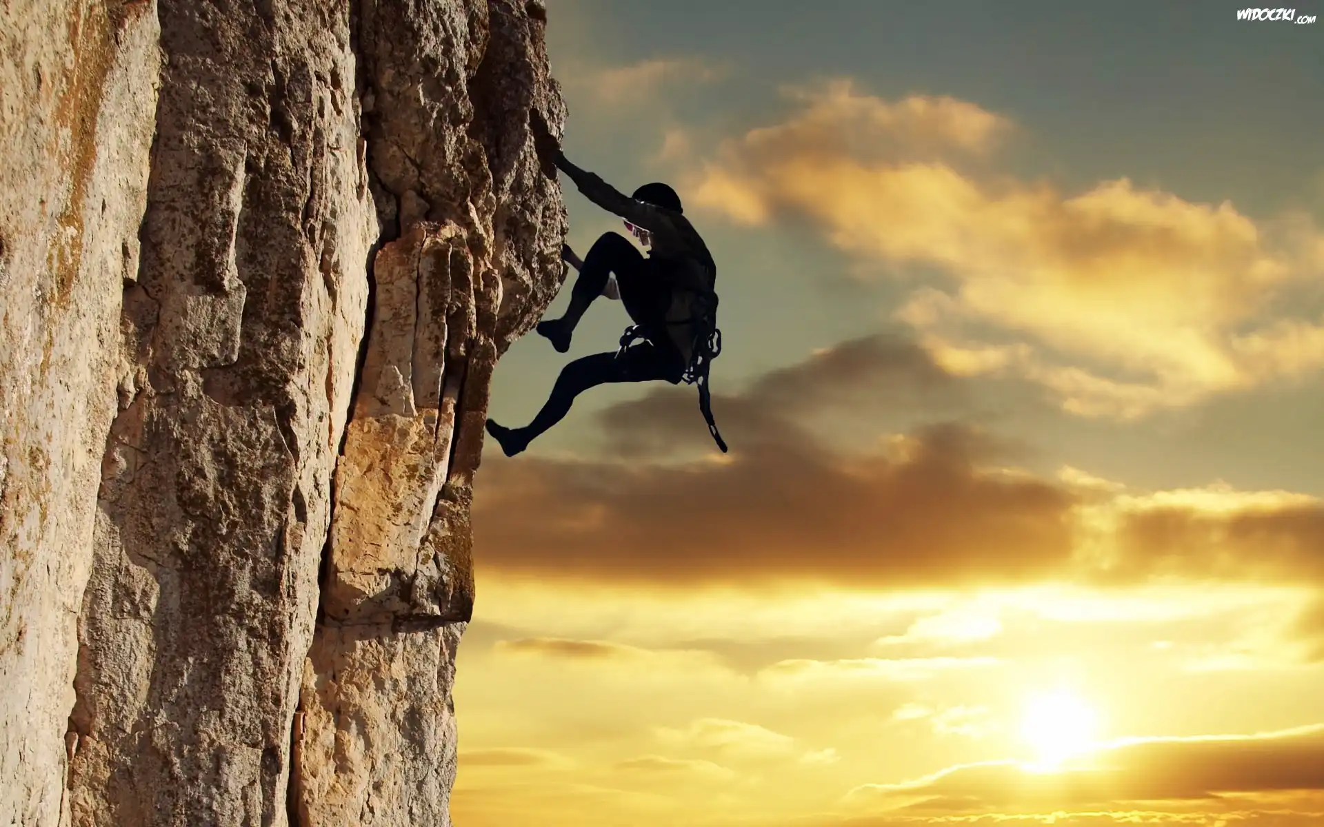 Wspinaczka, Skały, Chmury, Zachód, Słońca