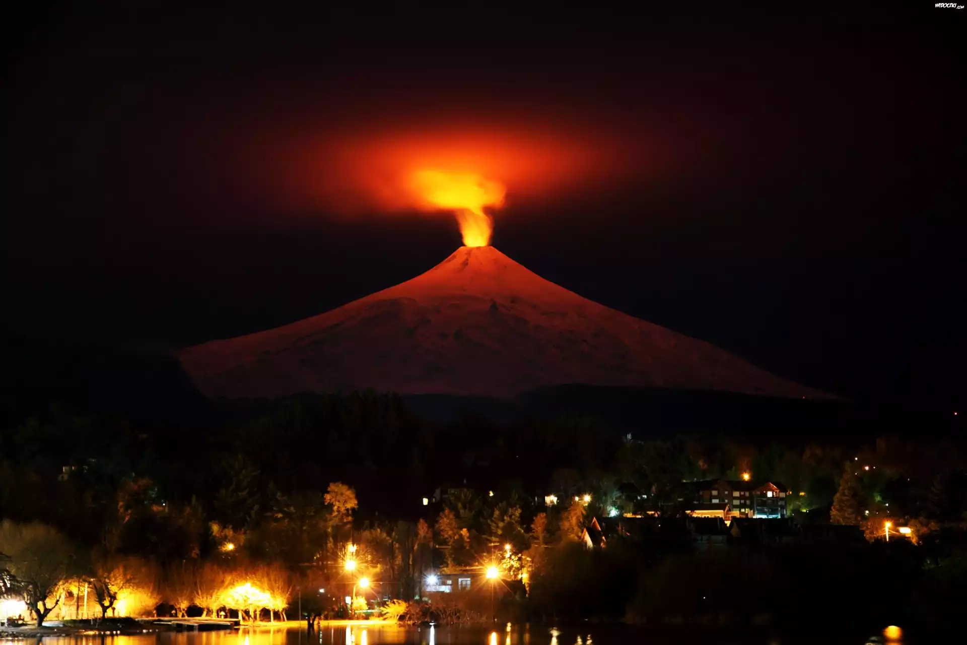 Wulkan, Ogień, Noc, Miasto, Światła