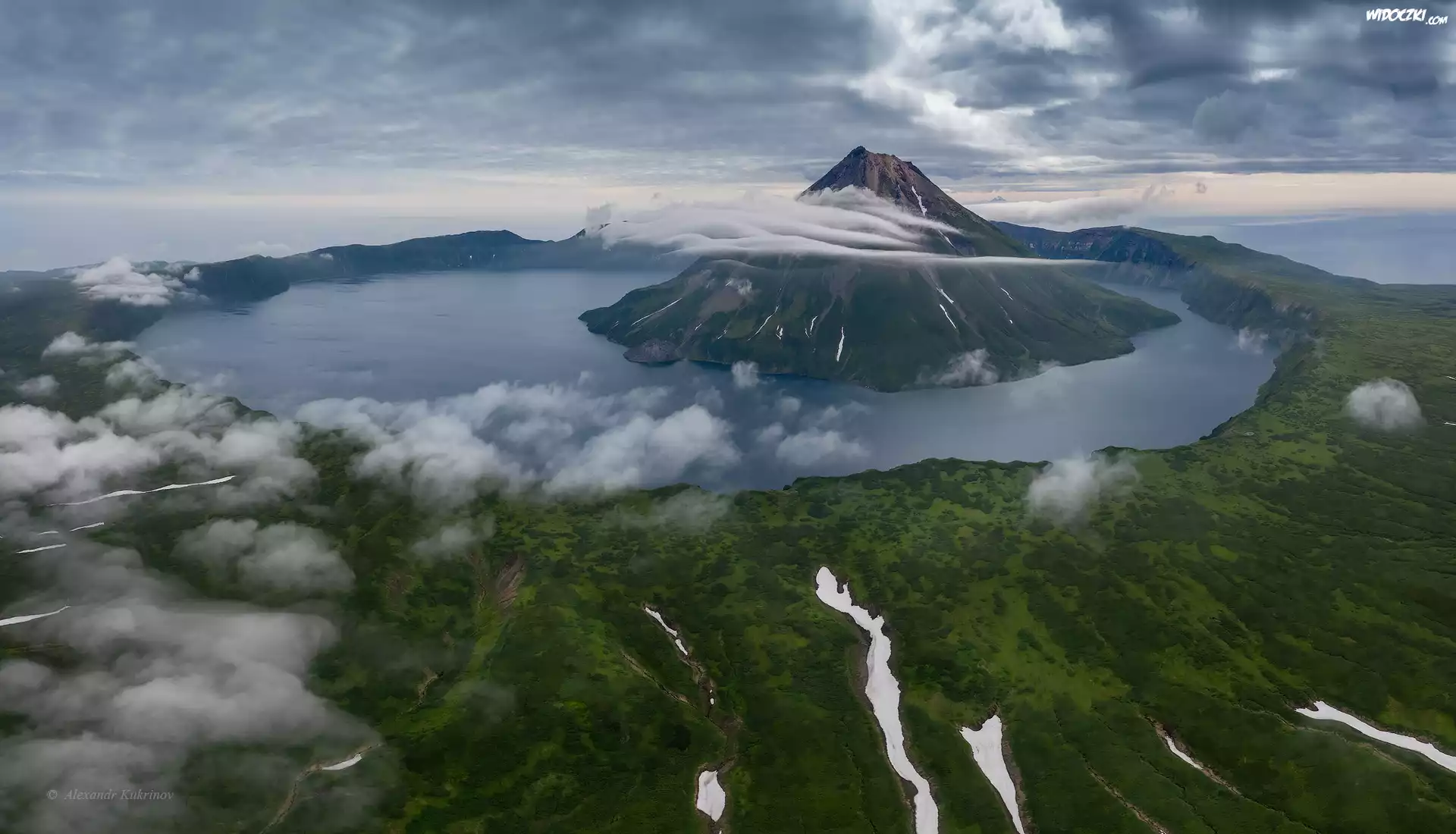 Zdjęcia, Wulkan Krenicyn, Wyspa Onekotan, Wyspy Kurylskie, Chmury, Z lotu ptaka, Obwód sachaliński, Rosja