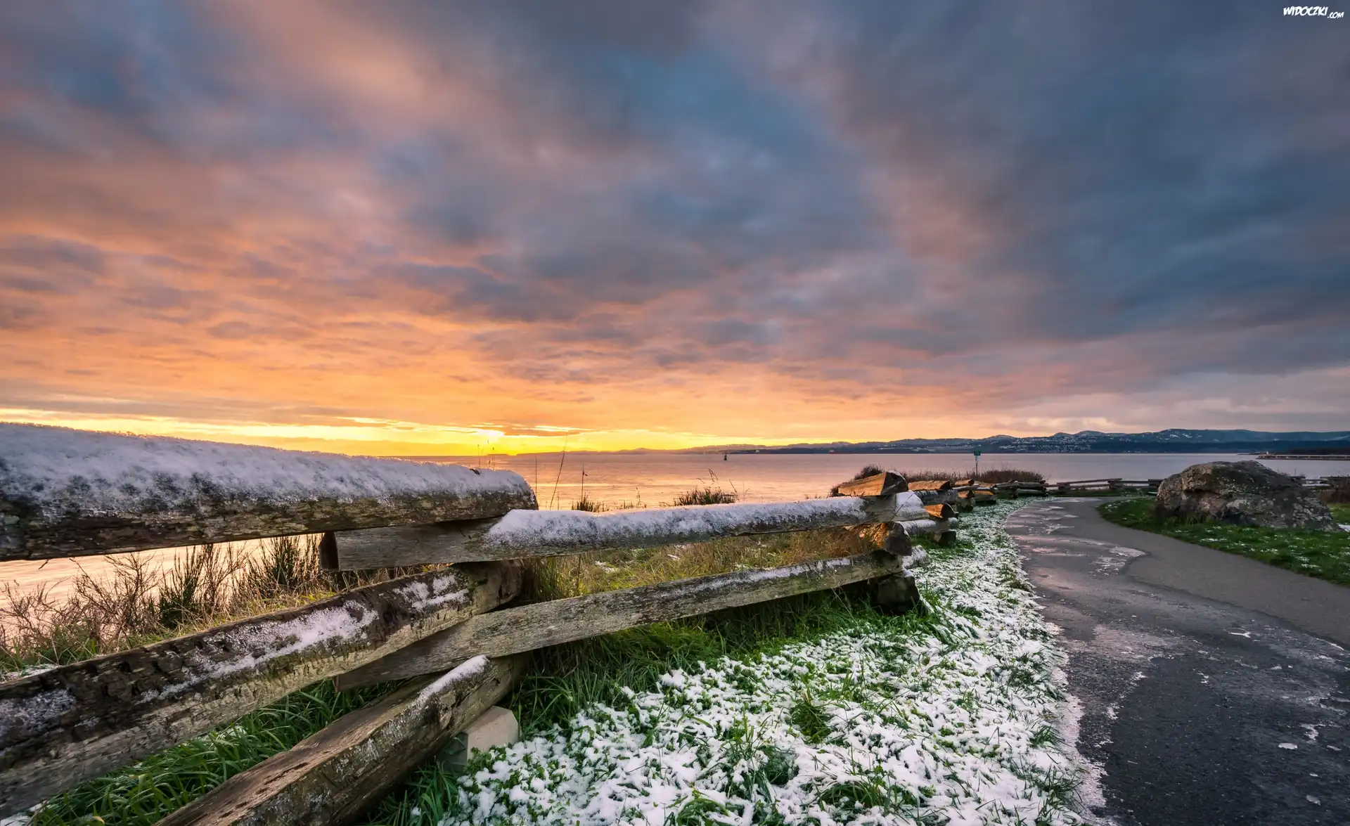 Zdjęcia, Kanada, Kolumbia Brytyjska Zachód słońca, Ogrodzenie, Zieleń, Morze, Wybrzeże