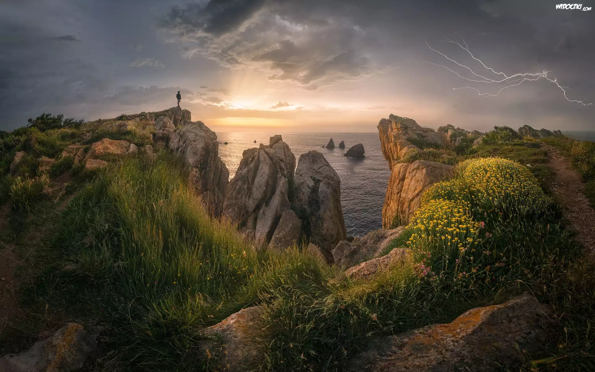 Hiszpania, Kantabria, Morze, Wybrzeże, Costa Quebrada, Skały, Zachód słońca, Chmury, Błyskawica, Piorun, Człowiek |