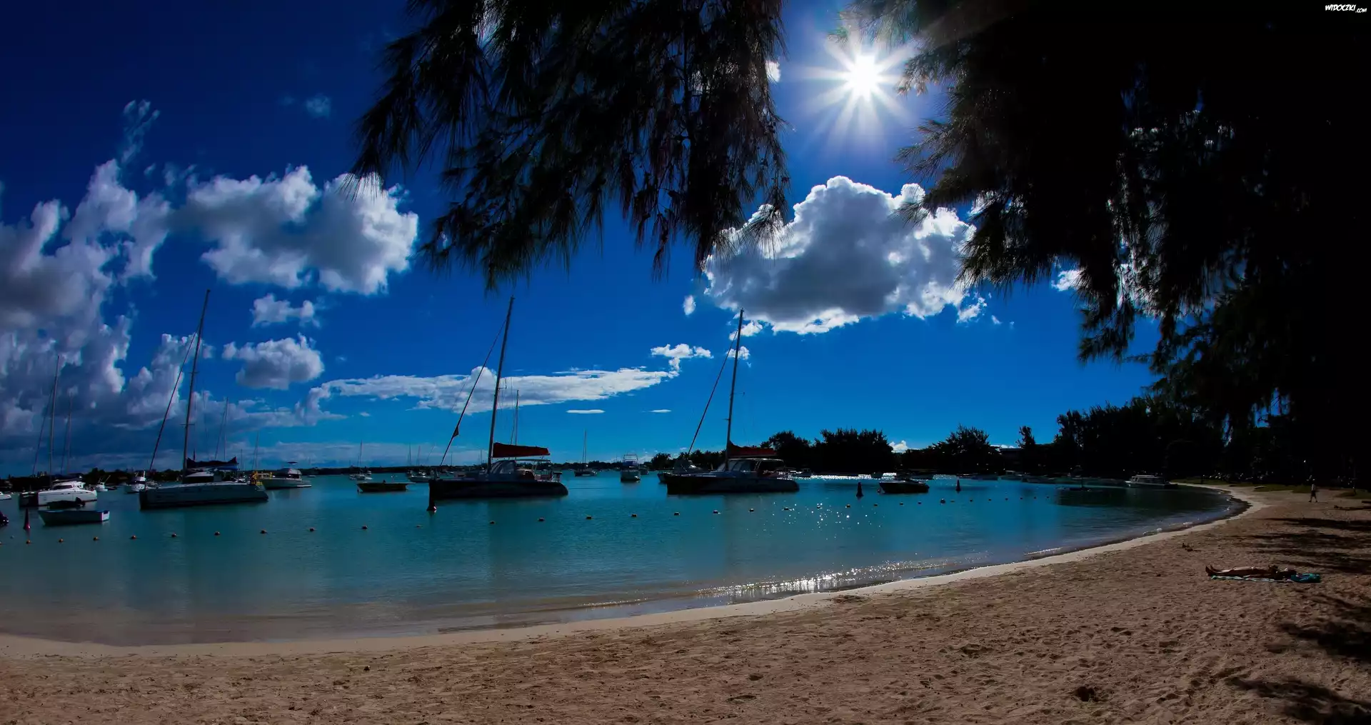 Wybrzeże, Żaglówki, Łodzie, Chmury, Promienie