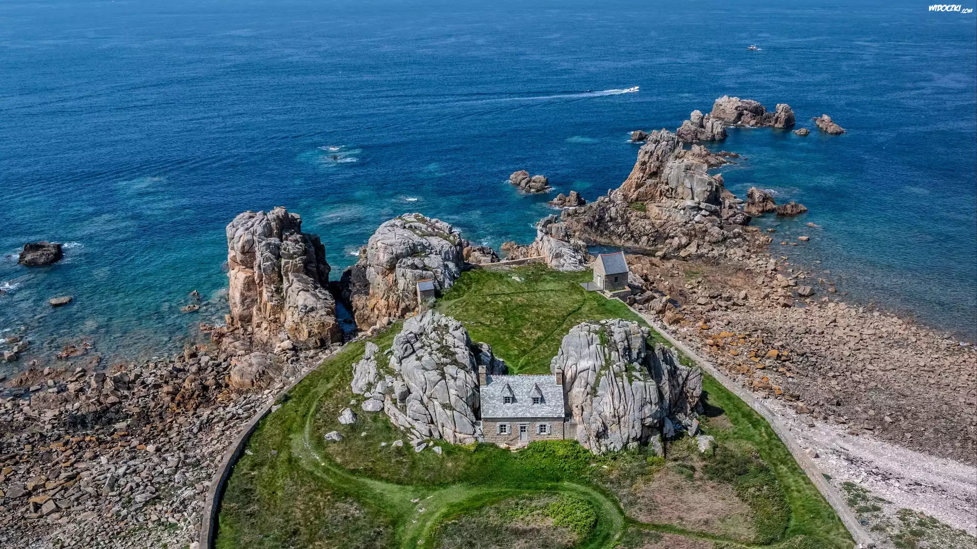 Zdjęcia, Francja, Plougrescant, Dom, Castel Meur, Skały, Morze, Wybrzeże