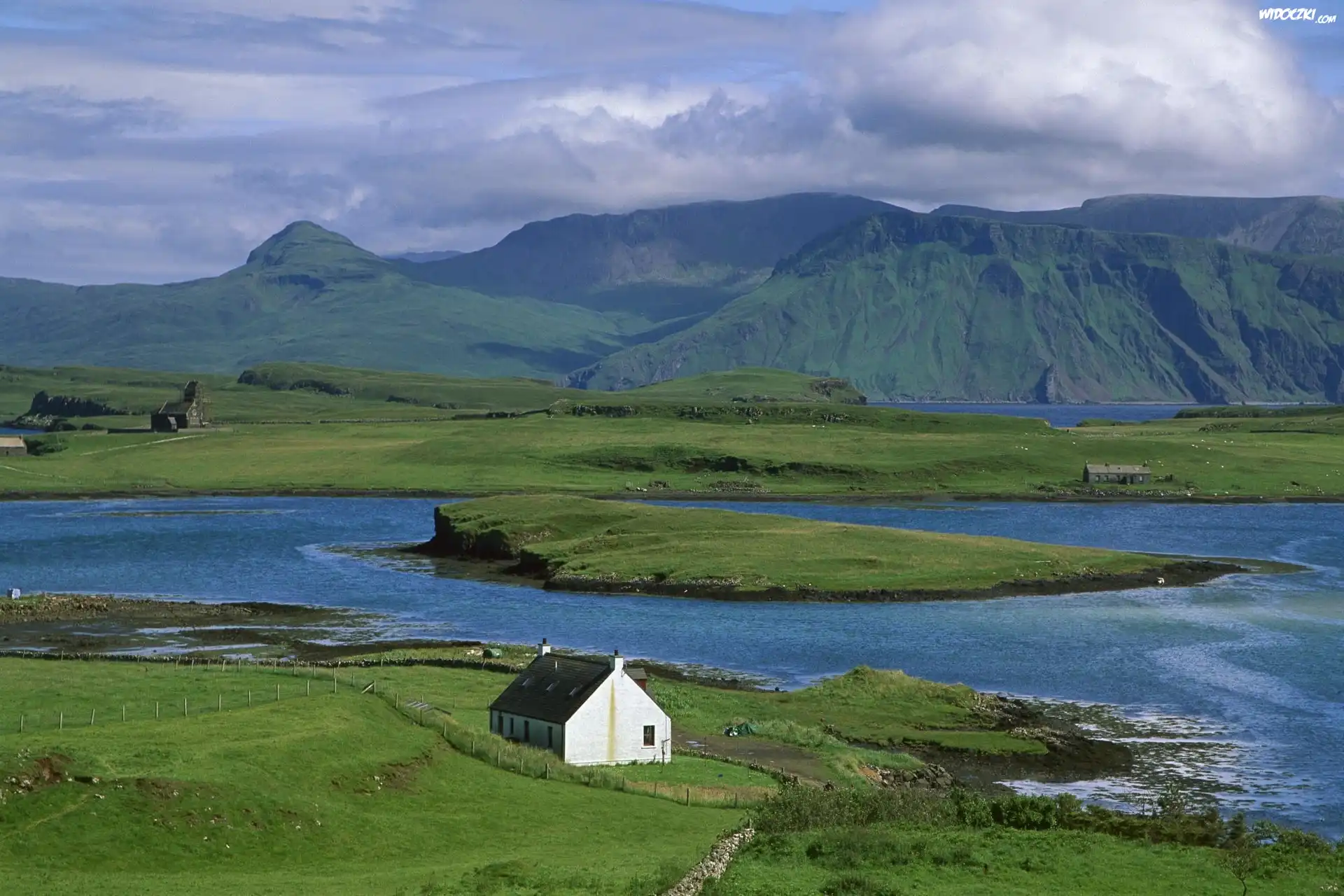 Zdjęcia, Łąki, Domek, Góry, Wybrzeże, Szkocja