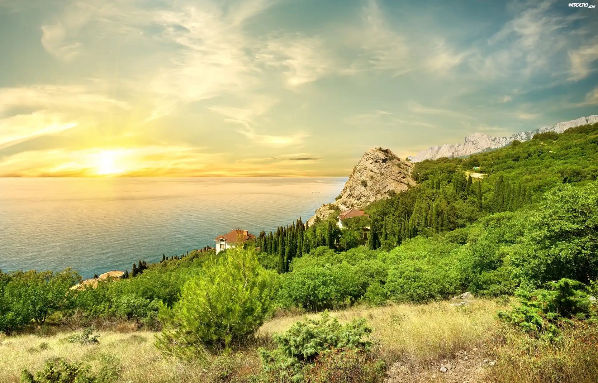 Krym, Wybrzeże, Morze Czarne, Wschód słońca, Drzewa, Domy