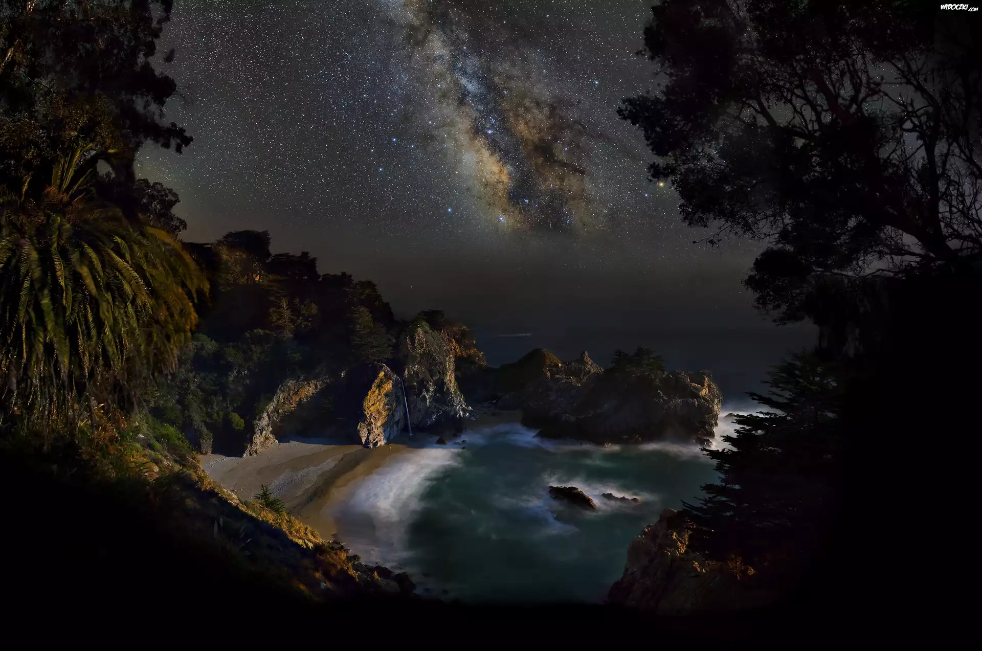 Zdjęcia, Wybrzeże, Zatoka, Noc, Niebo, Droga mleczna