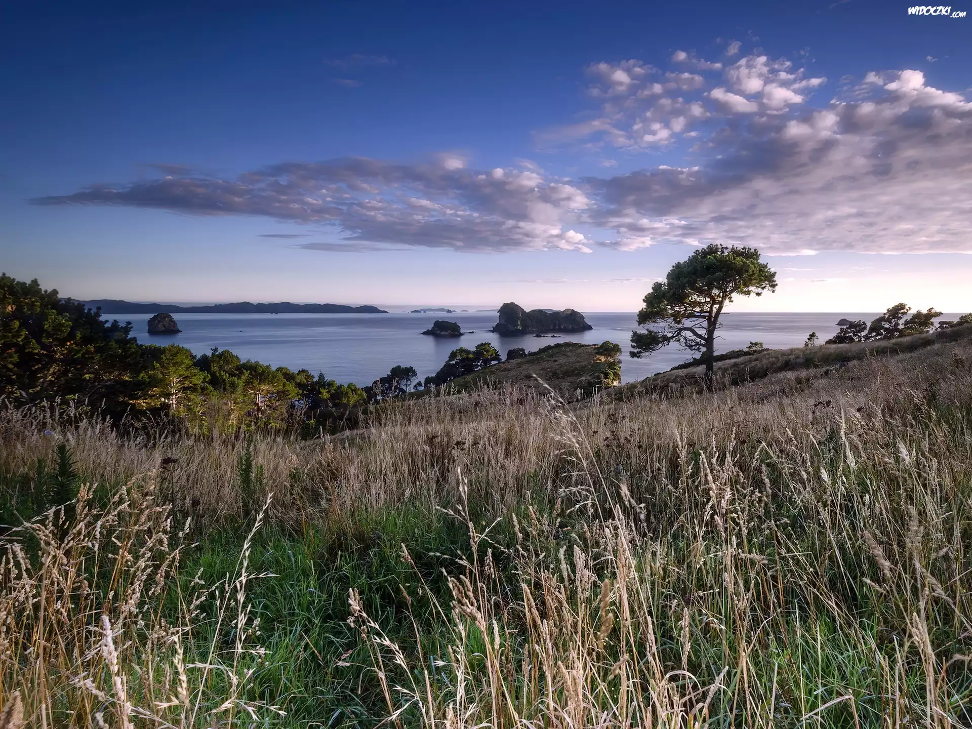 Zdjęcia, Wybrzeże, Trawa, Wyspy, Drzewa, Chmury