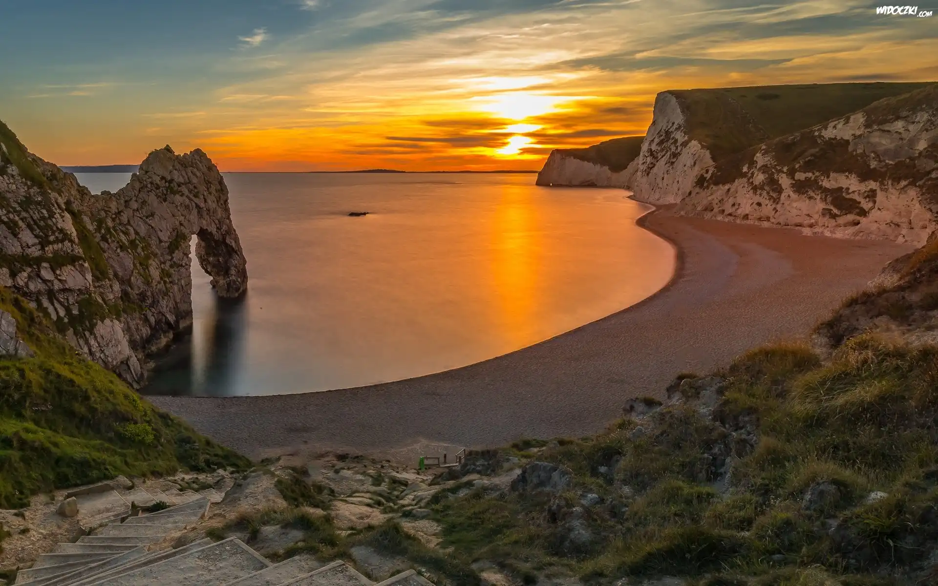 Zdjęcia, Anglia, Hrabstwo Dorset, Wybrzeże Jurajskie, Morze, Plaża, Skały, Łuk, Durdle Door, Zachód słońca