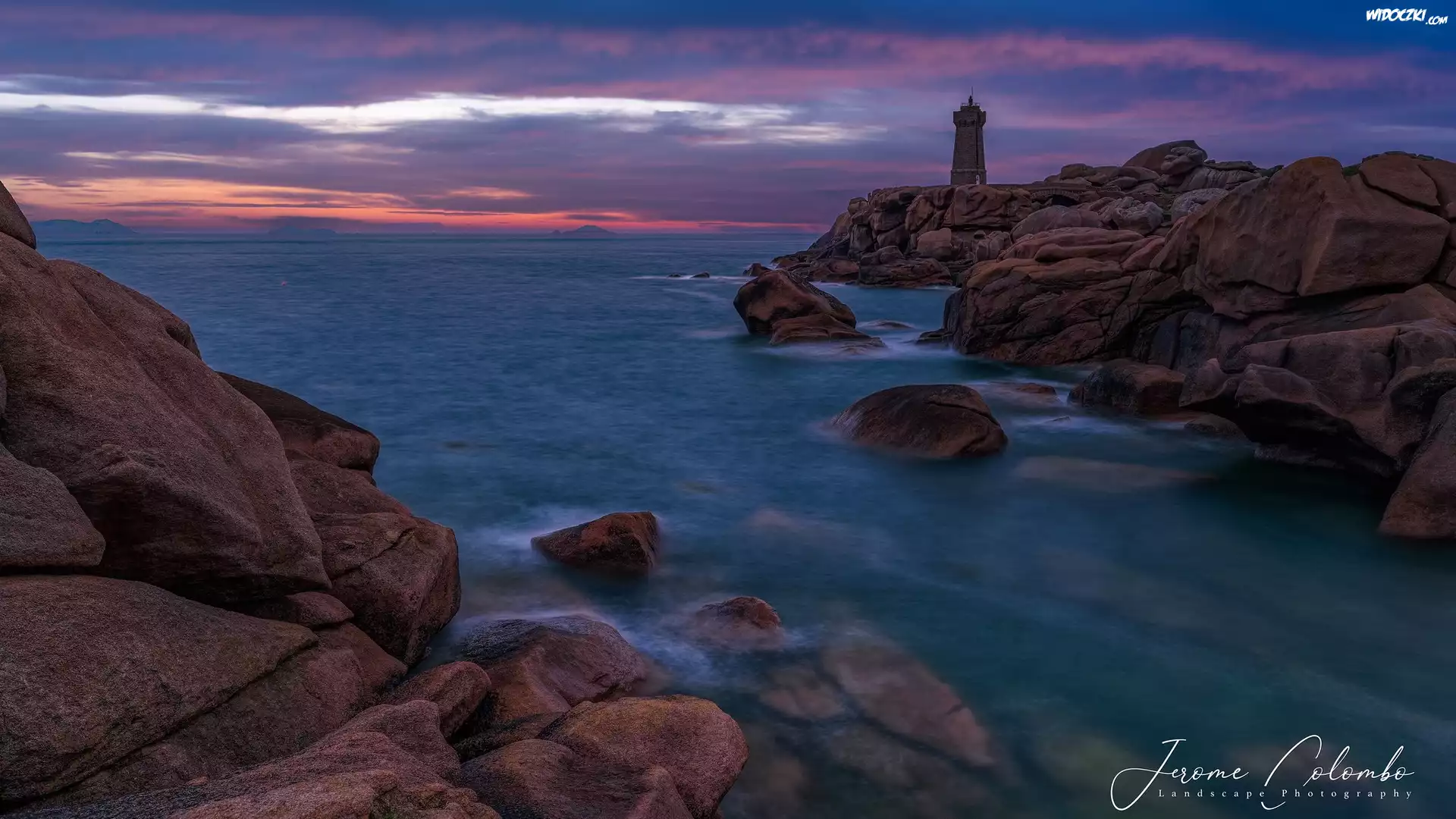 Francja, Bretania, Ploumanach, Morze, Wybrzeże, Skały, Latarnia morska, Phare de Mean Ruz, Zachód słońca |