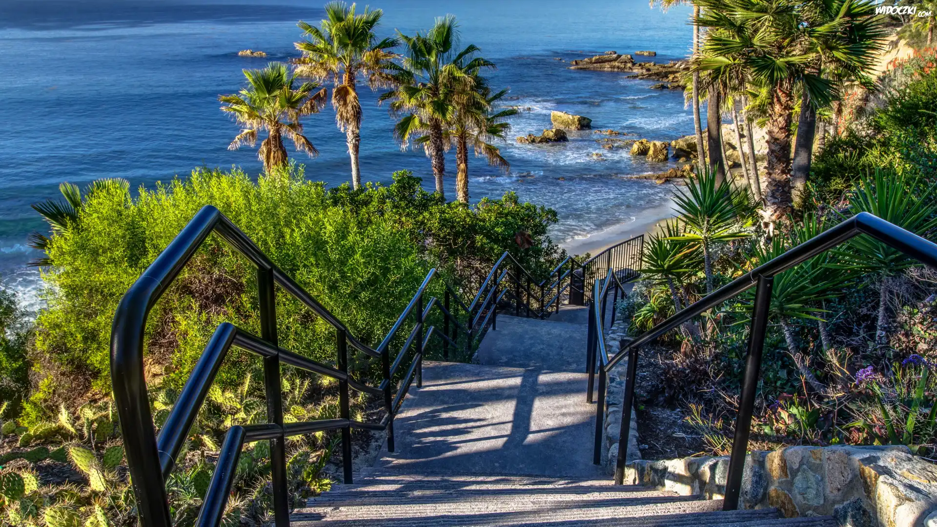 Wybrzeże, Ocean, Palmy, Schody, Kalifornia, USA