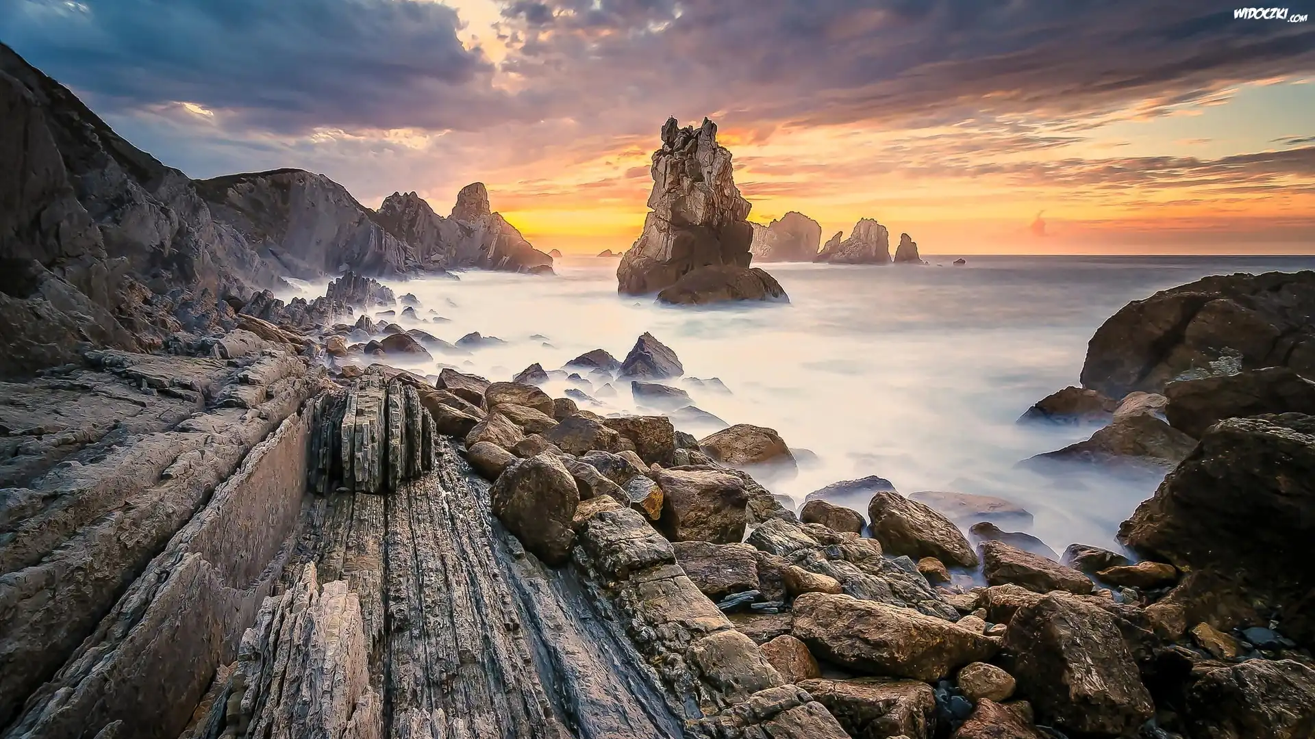 Zdjęcia, Hiszpania, Wybrzeże Costa Quebrada, Zachód słońca, Skały, Morze