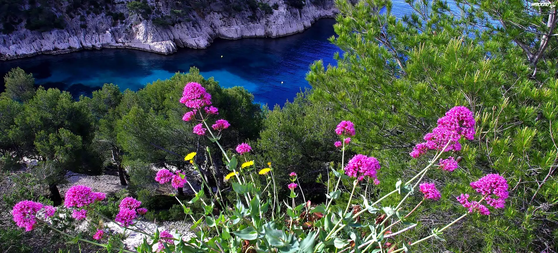 Zdjęcia, Wybrzeże, Skały, Morze, Kwiaty