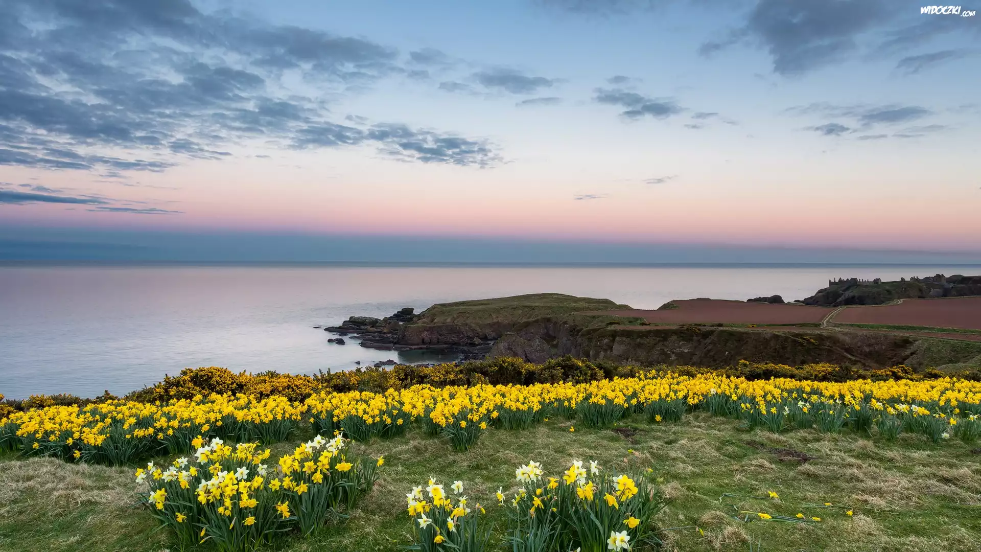 Zdjęcia, Wybrzeże, Morze, Kwiaty, Narcyzy żonkile