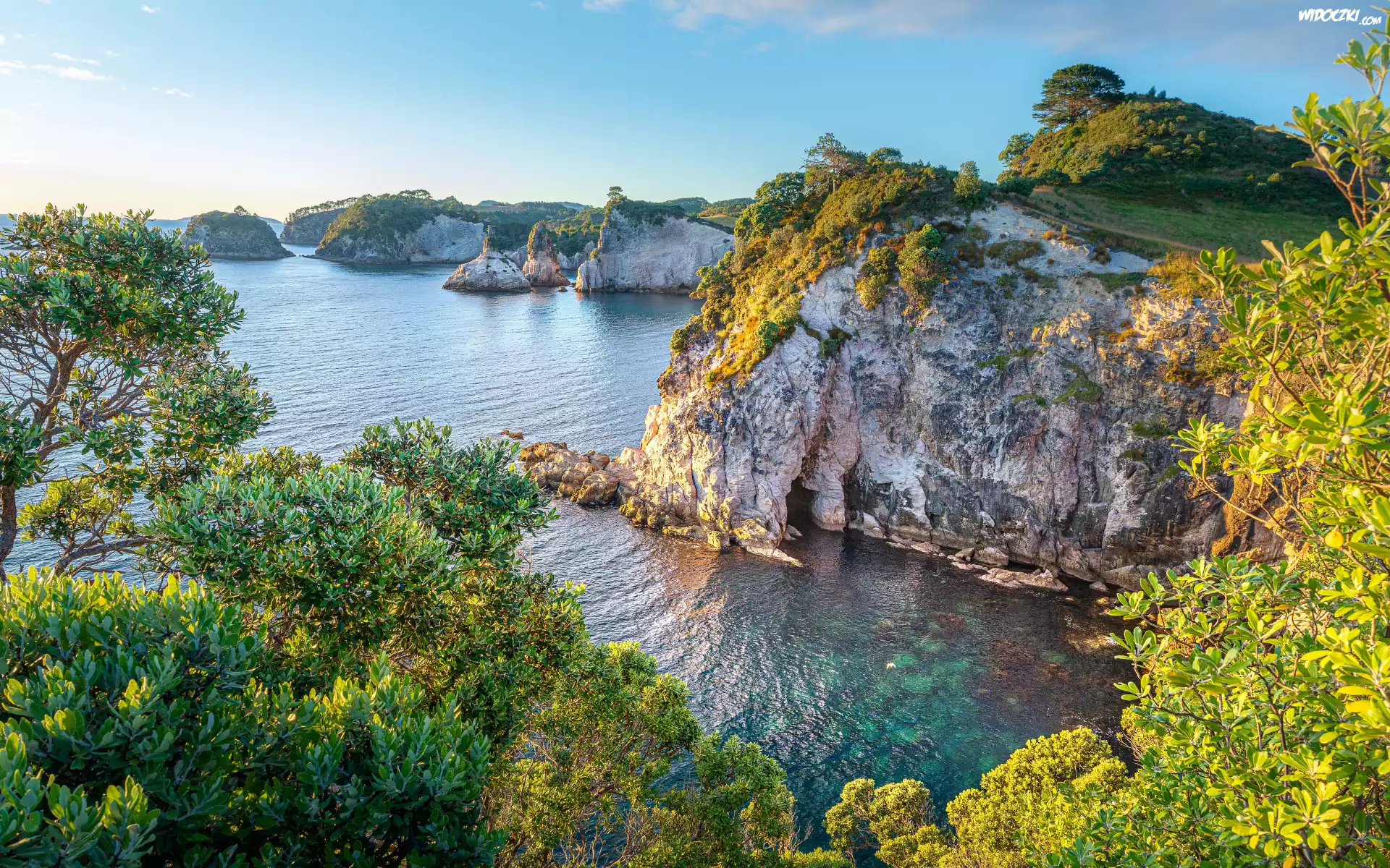 Zdjęcia, Morze, Wybrzeże, Skały, Zielone, Drzewa
