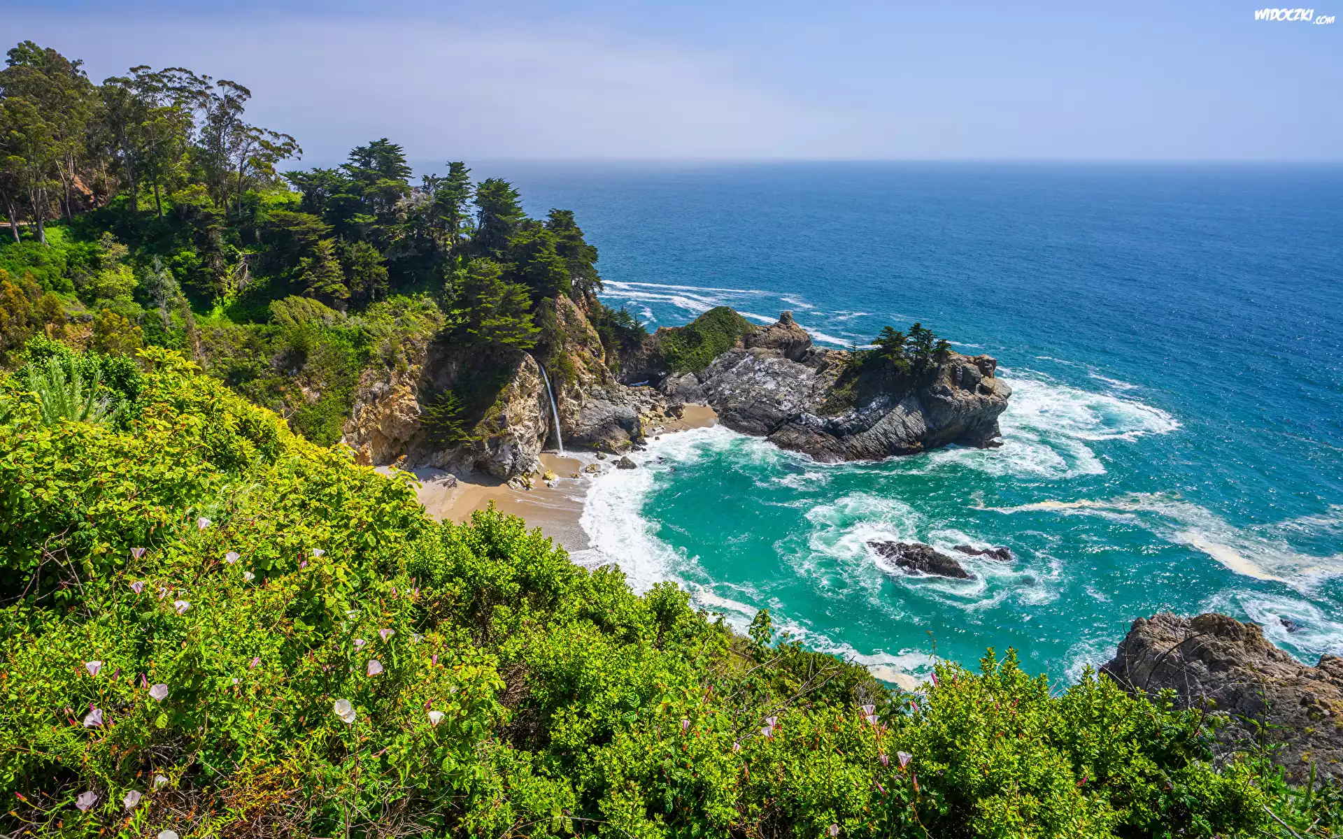 Zdjęcia, Stany Zjednoczone, Kalifornia, Wybrzeże, Big Sur, Zatoka McWay Cove, Skały, Drzewa, Krzewy, Morze