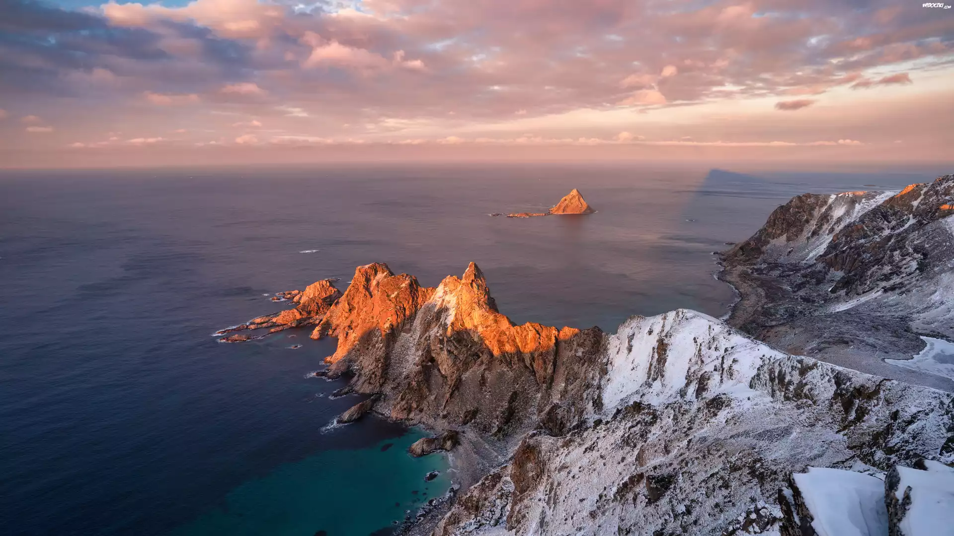 Zdjęcia, Wybrzeże, Morze, Ośnieżone, Skały, Chmury