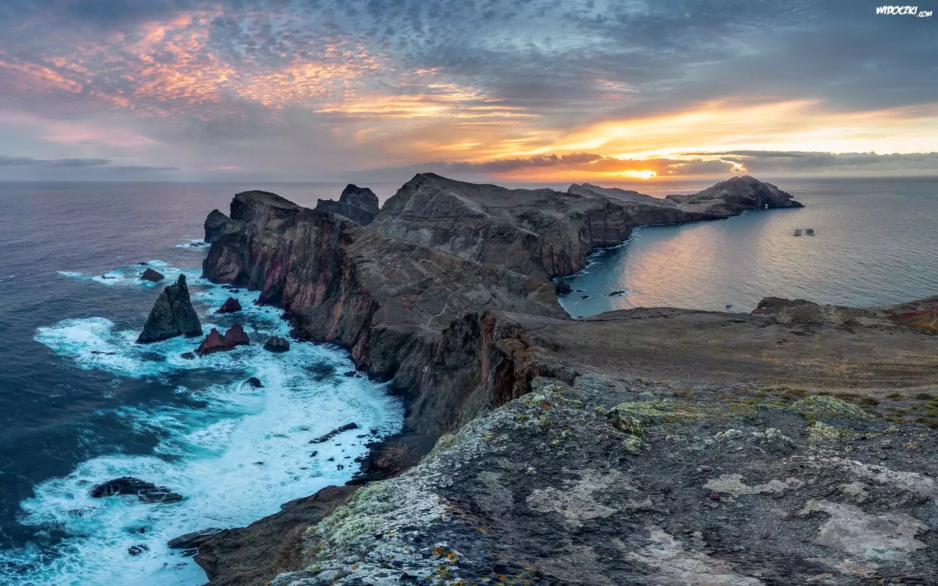 Portugalia, Madera, Półwysep św Wawrzyńca, Morze, Wybrzeże, Skały, Wschód słońca, Chmury