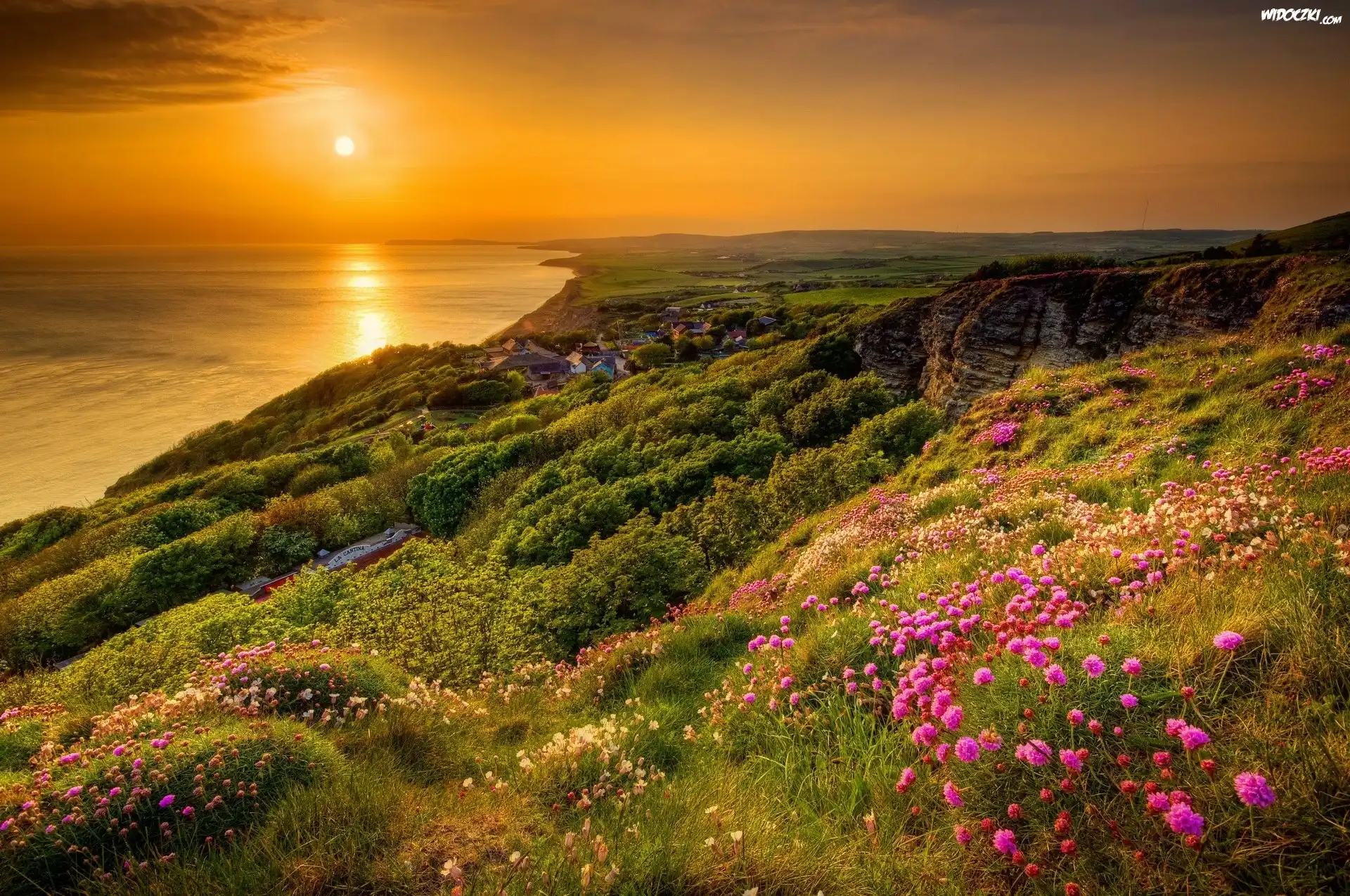 Zdjęcia, Wybrzeże, Roślinność, Łąka, Zachód słońca, Morze
