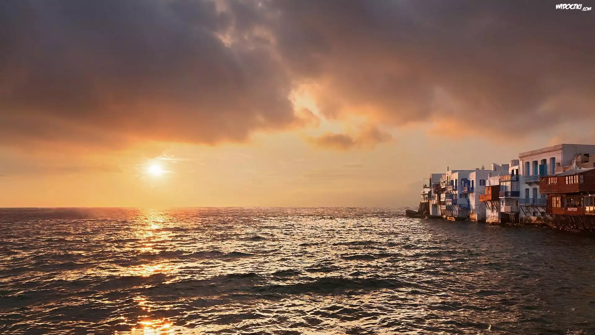 Zdjęcia, Wybrzeże, Wyspa, Mykenos, Zachód, Słońca, Domy
