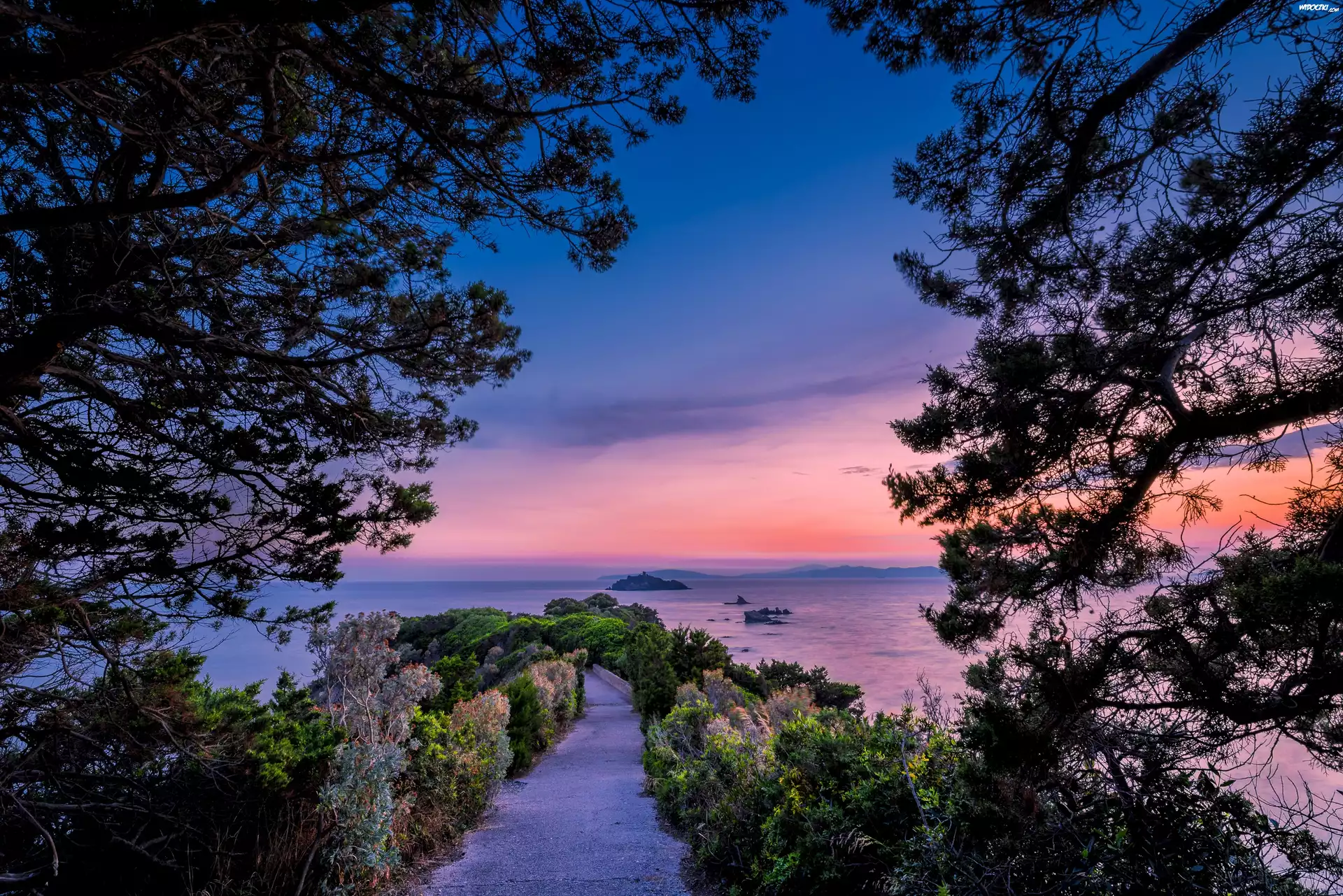 Zdjęcia, Wybrzeże, Morze, Zachód Słońca, Drzewa